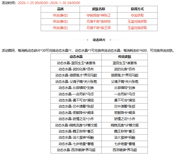 *2026-1-25 00:00:00 ~2026-1-30 24:00:00,夺锐扬旌*神张辽 100夺宝碎片、炎焚万军*刘辟 70夺宝碎片 限时上架夺宝商店。2026-1-31 00:00:00 起,夺锐扬旌*神张辽、炎焚万军*刘辟 下架。
