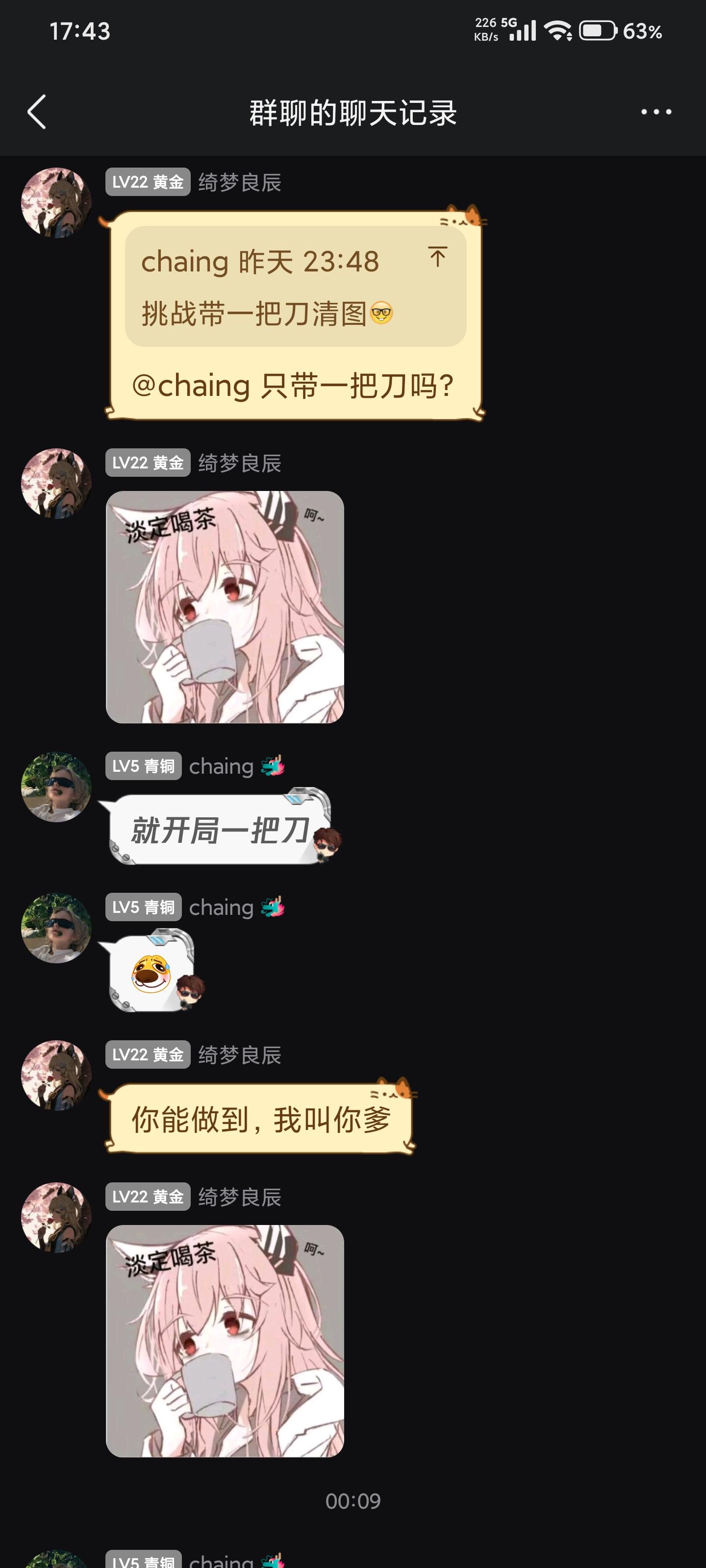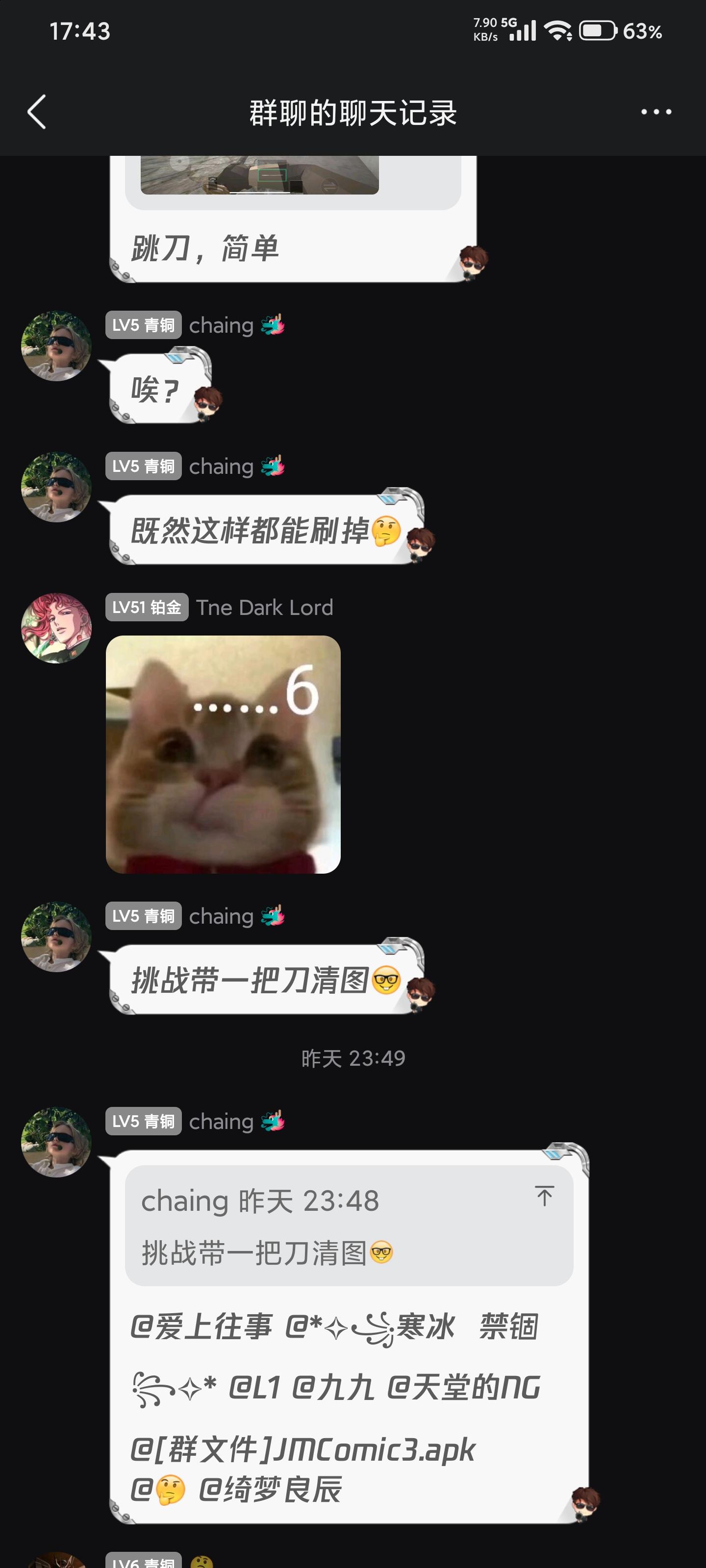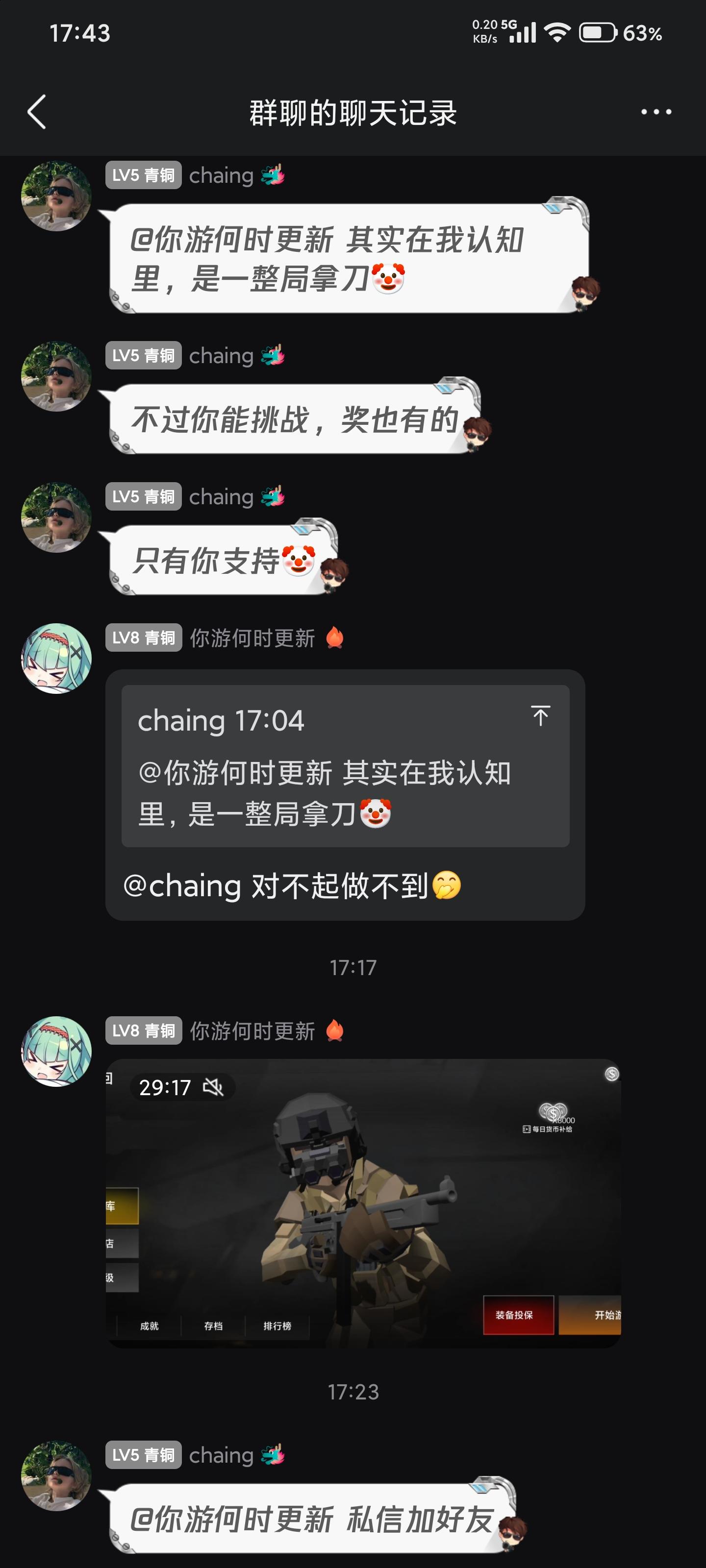一开始,我只是在教新手跑刀,跳起来砍人机可以无伤,然后一股脑发了个挑战(用一把刀清图)起初各个大肘子们不是无语就是嘲讽,觉得最不到,只有他坚持做到了,虽然他用了枪不过清图并撤离,我也信守承诺给了挑战费