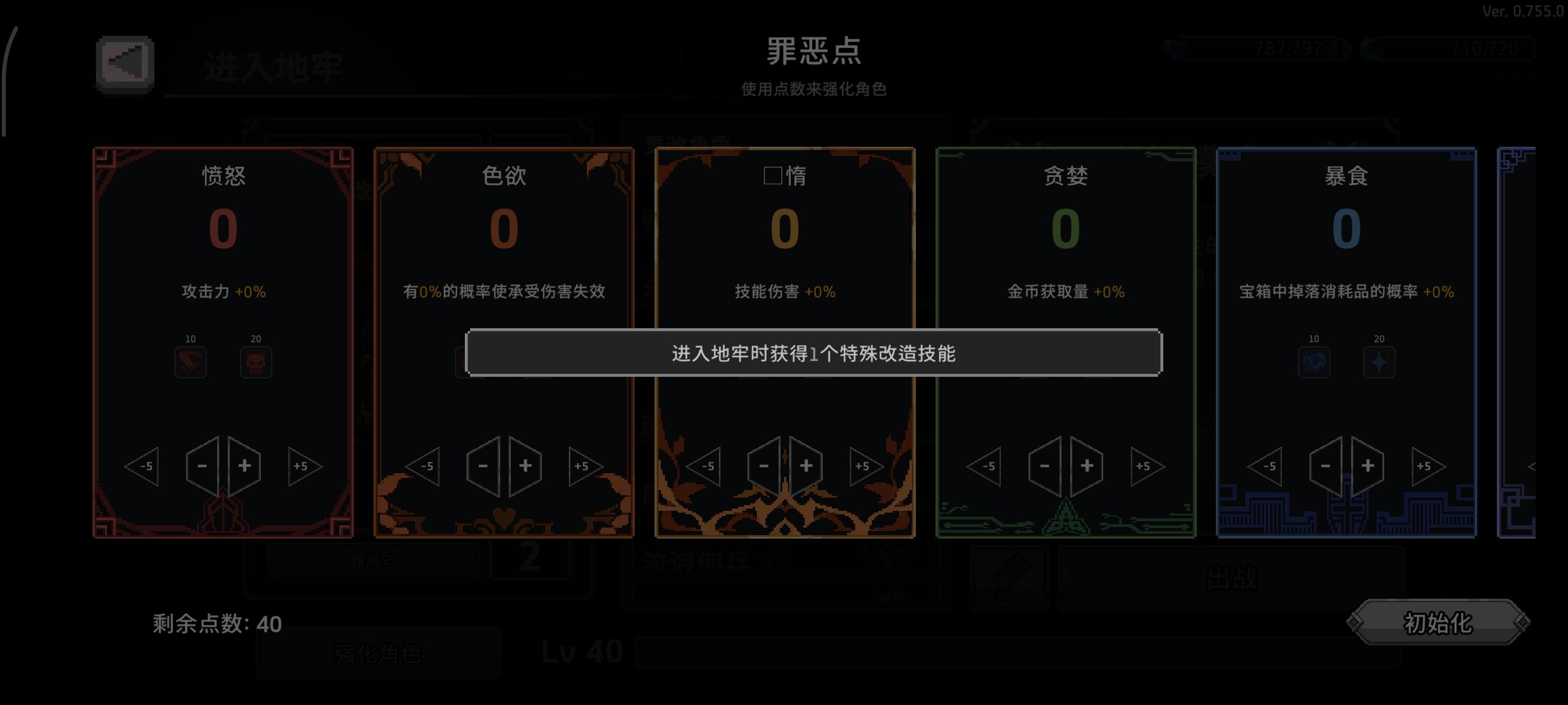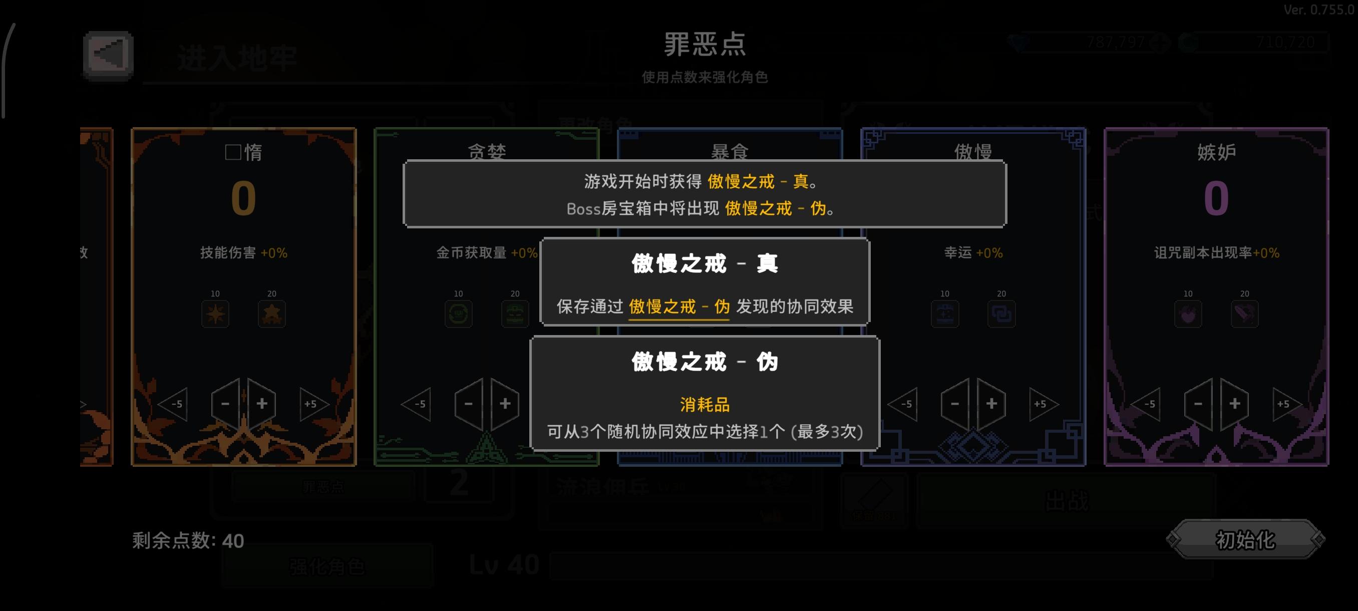 懒惰加点20级加强,从原先开局三选一特改技能,变成每进入一个大章三选一特改技能。傲慢加点20削弱,原先直接获得随机协同,现在需要装备开局给的傲慢之戒真,然后从boss宝箱获得的傲慢之戒伪获得的协同才会生效。然后每日任务每周任务奖励加强。