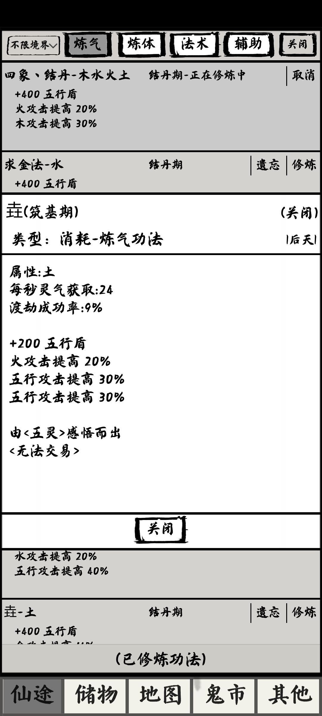 功法:每个角色在每个大境界要修对应的功法,对应属性的灵根修为才能上涨,并且在突破大境界时,功法的加成属性会固定下来。比如上图是土属性的筑基期练气功法,在筑基后期突破到结丹期时你是用该功法突破,那么它附带的这几条属性加成会固定保留,不影响你结丹期开始切换修炼结丹期的功法。