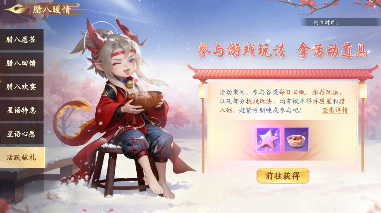 1月24日5:00-1月27日5:00期间,前往【腊八暖情】活动,和仙友们共享美味腊八粥,一起求得愿成吧!