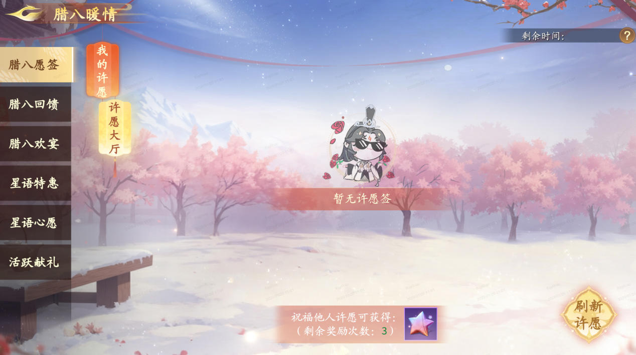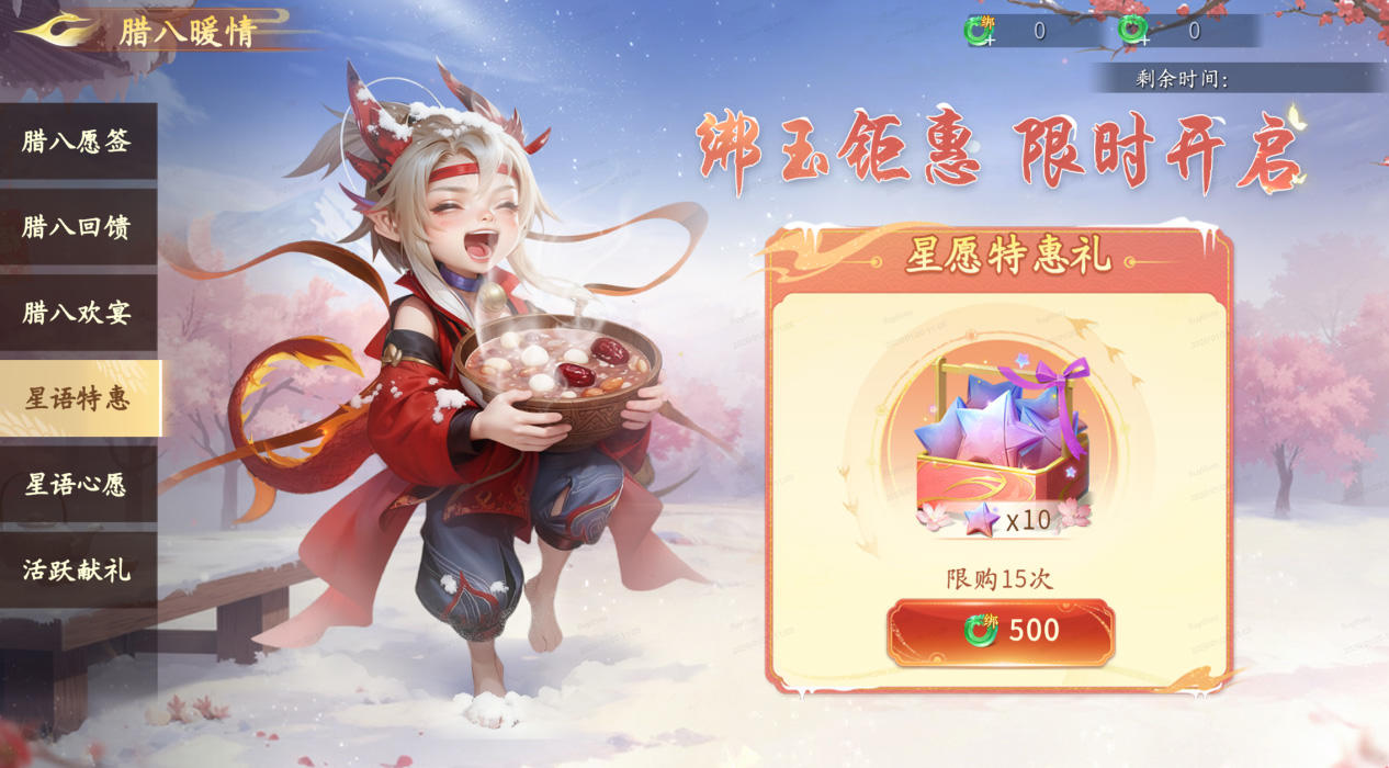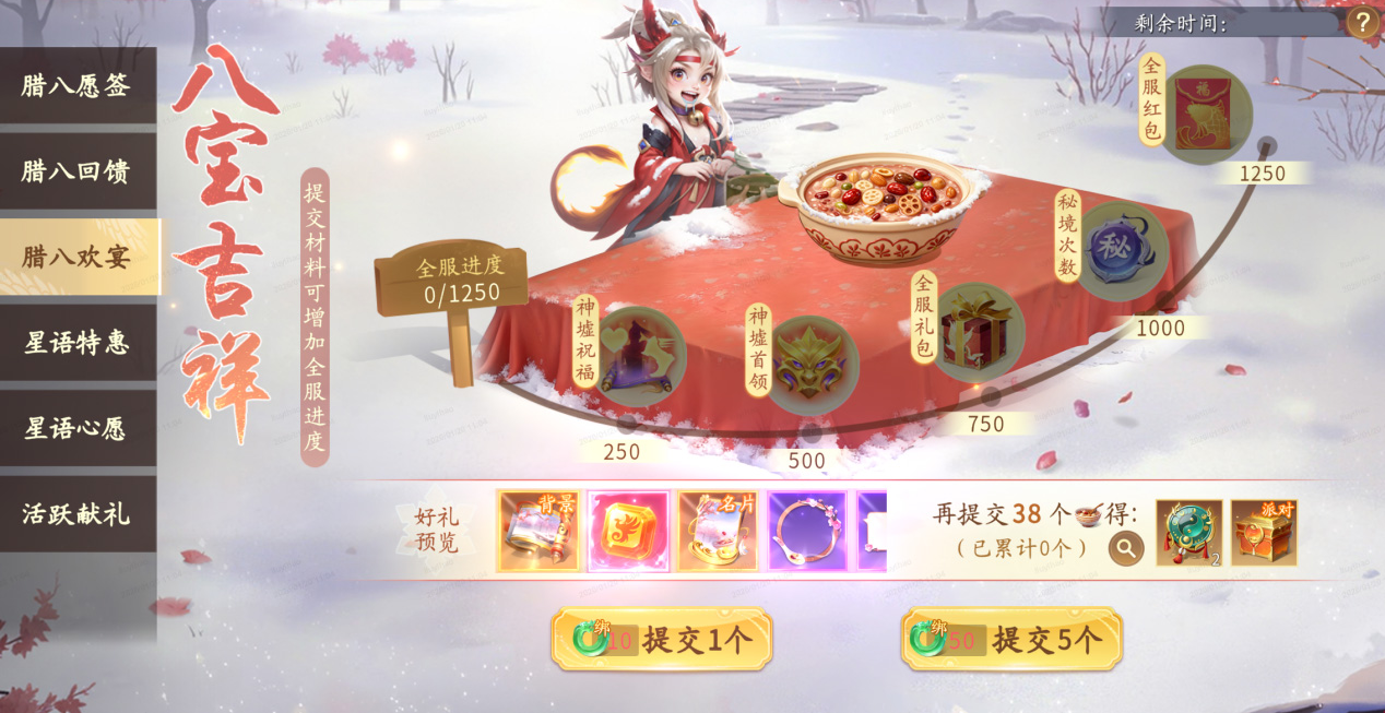 参与每日玩法和许愿将有概率获得腊八粥,每日可提交道具或花费绑玉代替提交(10绑玉提交1个),每次提交均可获得提交奖励,累计提交达指定数量还可领取珍稀奖励。