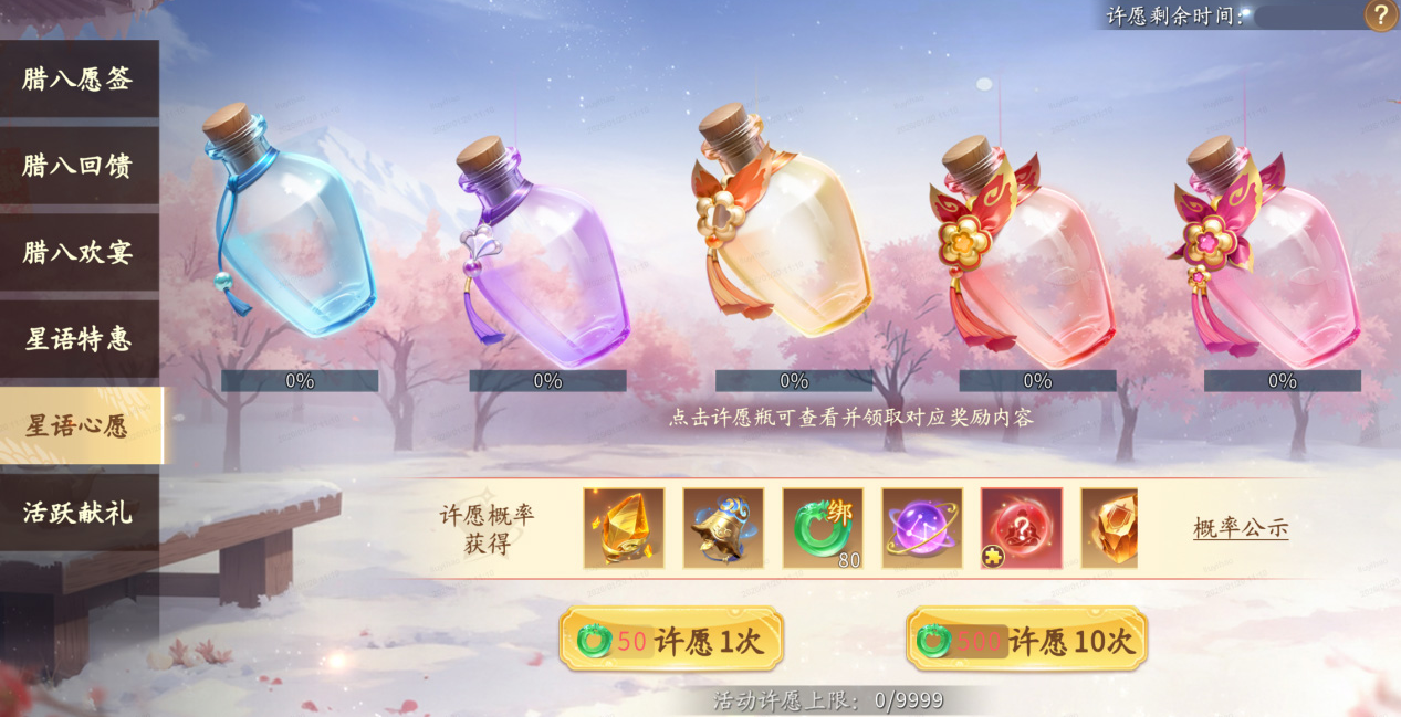 1月24日5:00-1月28日5:00期间,使用许愿星或花费仙玉可进行许愿(50仙玉许愿1次),每次许愿都可获得许愿奖励,并随机增加心愿瓶能量。当心愿瓶能量≥100%时,可选择并领取对应瓶子中的心仪奖励!需要注意:1月27号5:00到1月28号5:00只能领取奖励,不能进行许愿哦~