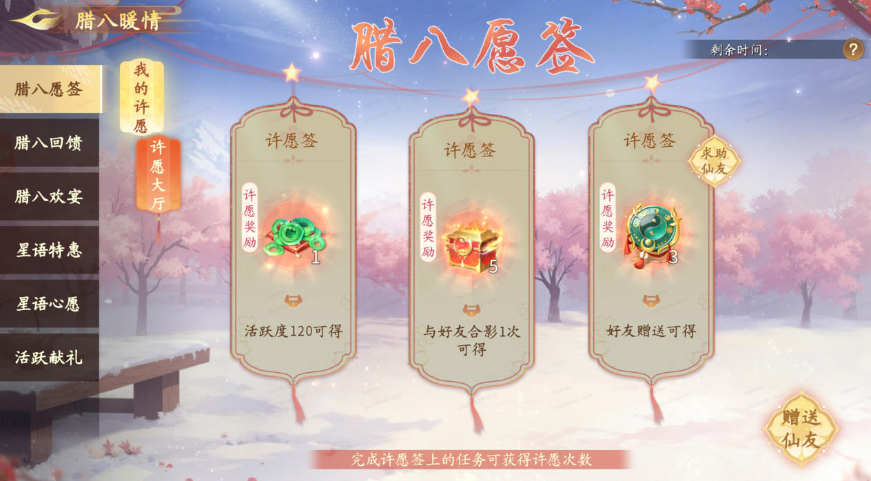 参与每日必做、部分推荐玩法和挑战玩法,都有概率获得许愿星和腊八粥,快与仙友一起组队打本吧!