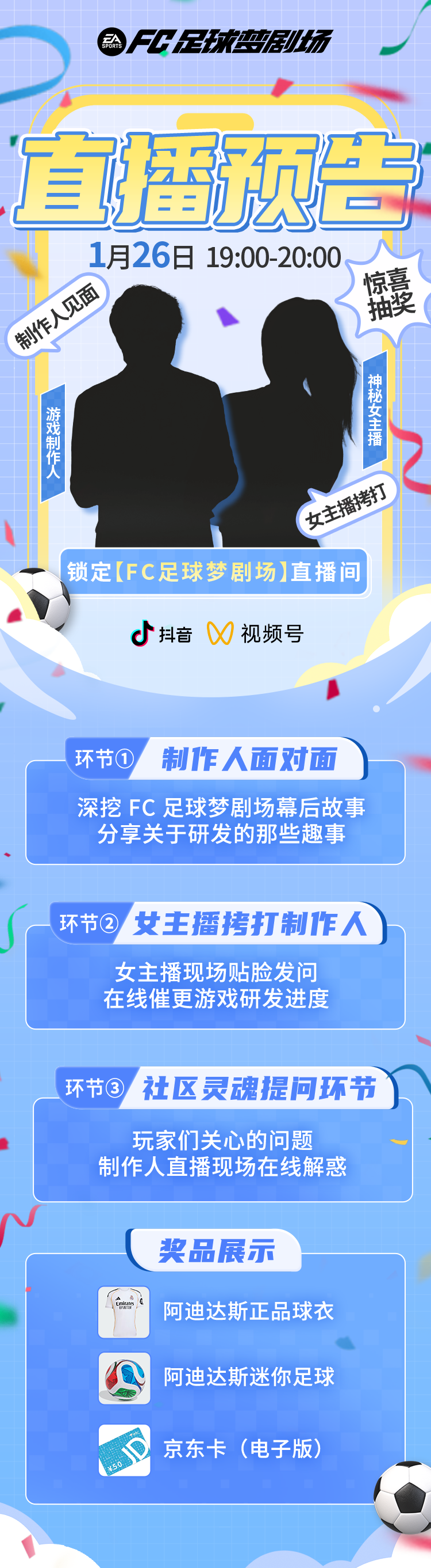 大家一直关心的研发进度、后续规划,这次都会和大家解答,当然还有阿迪达斯正品球衣、阿迪达斯迷你足球、京东卡等直播好礼也绝不缺席~而且听说这次还有“新朋友”亮相直播间噢!
