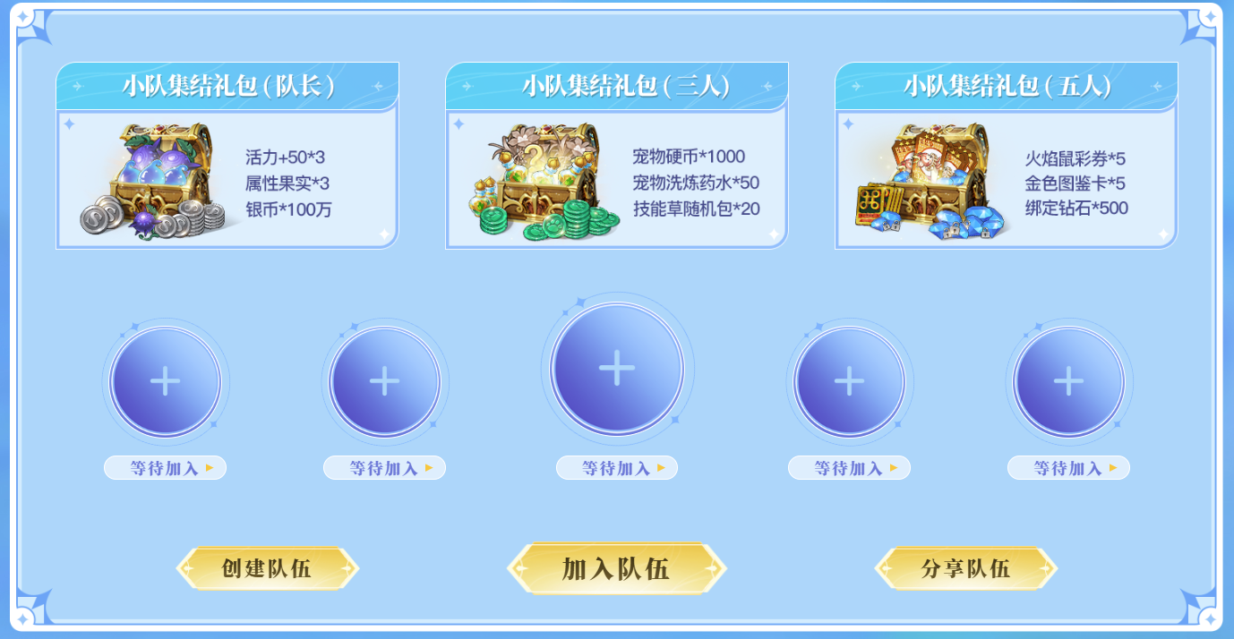 活动期间,成功预约后即可创建小队,队长可分享队伍链接,邀请好友加入队伍!队员开服后达到相应等级即可获得对应的小队礼包!