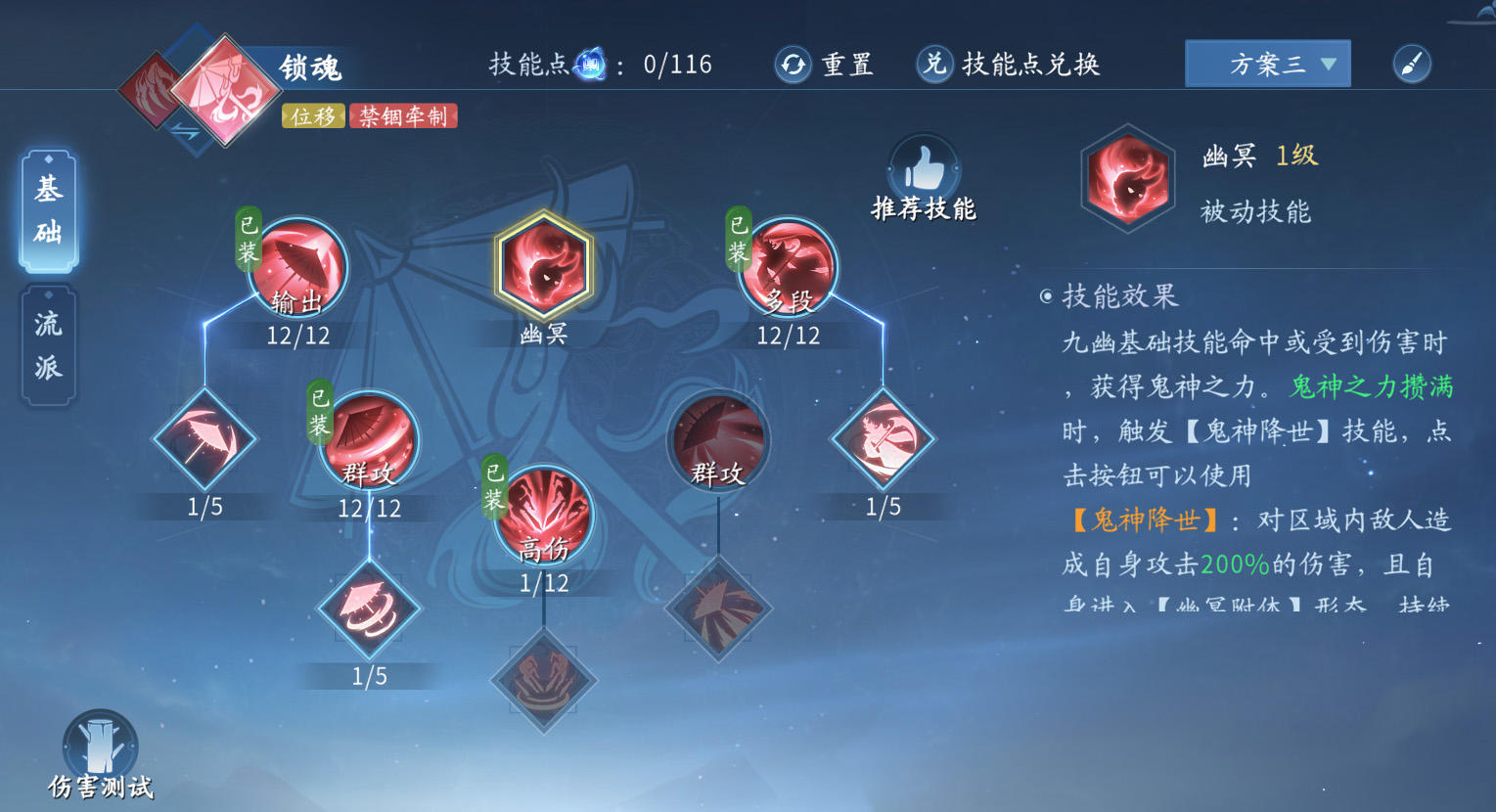技能装配:基础位移技能【魅影闪击】和流派位移技能【罗刹破狱】必带。由于锁魂流派自带禁锢效果,因此基础控制技能【黄泉逆浪】可选择不带。