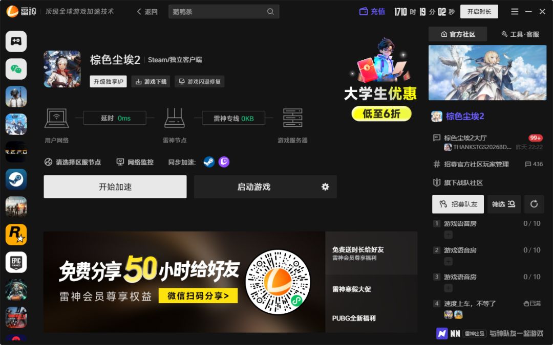 1. 打开雷神加速器搜索并加速“棕色尘埃 2”。