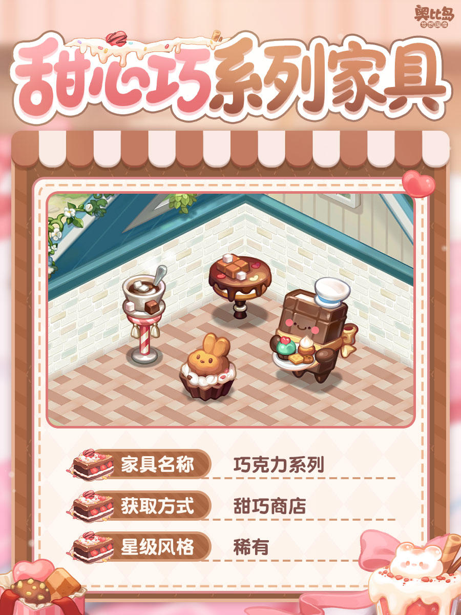 小奥比们参与「甜心巧」限时活动,可获得道具「奥比巧克力」。「奥比巧克力」可在「甜巧商店」免费兑换「粉棕格纹毛背心」「粉棕百褶裙」「浓巧热可可杯」「爱心波点长裤」等装扮,以及「巧克力展示柜」「巧克力地毯」「巧克力萌兔小椅」「巧克力嘻嘻大厨」等家具,小奥比们不要错过哦~