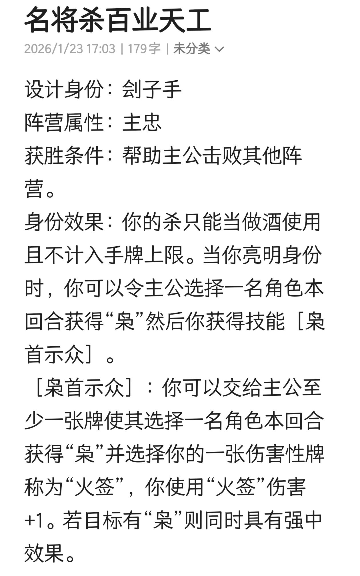 身份效果:你的杀只能当做酒使用且不计入手牌上限。当你亮明身份时,你可以令主公选择一名角色本回合获得“枭”然后你获得技能[枭首示众]。