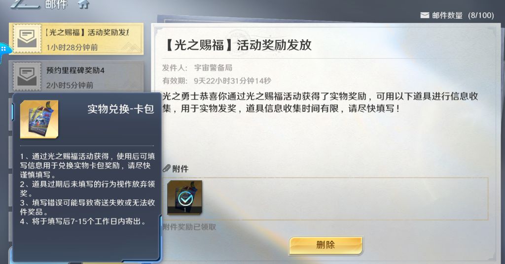 - 兑换流程:奖励会通过游戏邮件发放。请在获得道具后的 30天 内填写准确的收件信息,奖励将在信息提交后的 7-15个工作日 内寄出。