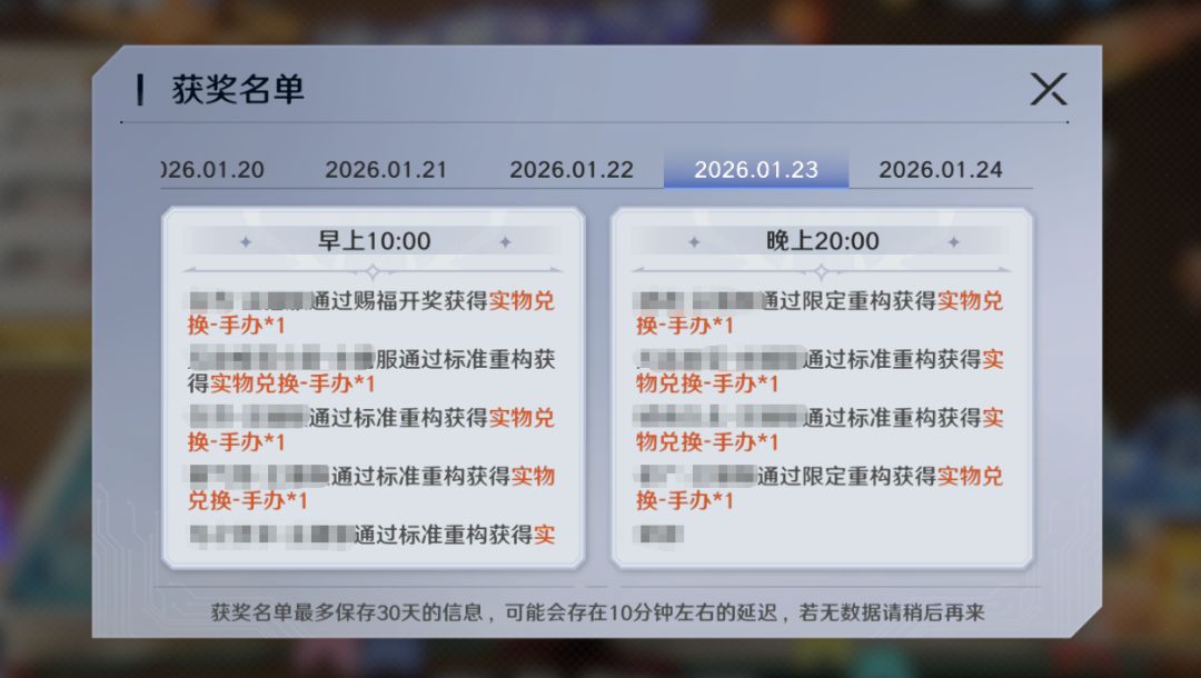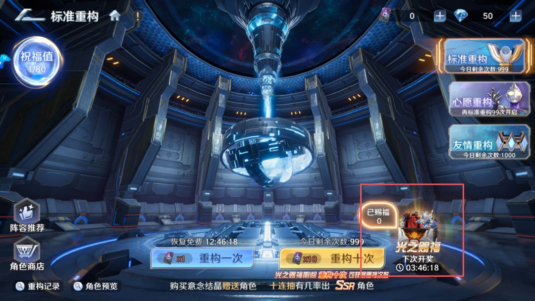 3.在活动期间进入重构功能参与限定重构的重构十次,标准重构的的重构十次,心愿重构的的重构十次,手办招募的招募十次,闪卡卡包的打开五次均可获得赐福次数,赐福次数会默认参与当前未开奖的赐福奖池中,每个阶段开奖时会结算并清除全部的赐福次数,新的赐福次数会参与下一个赐福奖池中,每日20:00开奖后的赐福次数会默认参与次日阶段一的奖池中,请大家放心参与,不会浪费赐福次数,赐福次数越高,赐福奖池开奖时获奖概率越高 注意:单次的重构、招募、打开卡包不能获得赐福次数