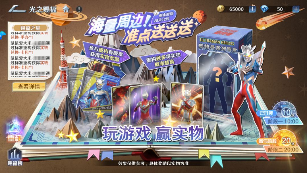 4.本次的实物兑换奖励:获得实物兑换-手办可兑换奥特曼盲盒手办*1,概率获得实物兑换-卡包可兑换奥特曼相关卡包*1,具体奖励以实物为准
