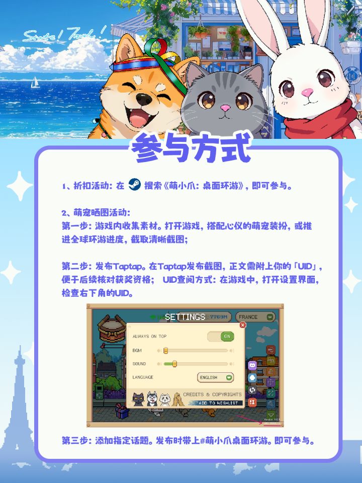 在小黑盒,分享你的萌宠穿搭或游戏进度,附上游戏ID,带上#萌小爪桌面环游 。我们选10位玩家,于下个版本发放本次活动限定装扮。