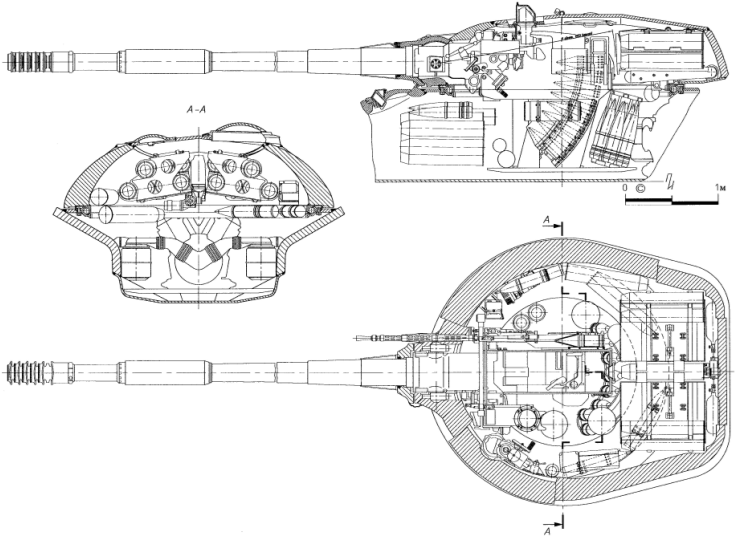 278工程的炮塔和277工程的初版相同,半球形,带尾舱,顶部后方向下倾斜。278工程配备了自动装弹机,弹药分置于三处:尾舱内部是药筒,分两层放置;火炮右侧有一个步枪弹匣式的机构用于存放穿甲弹头,炮塔座圈后部下方是一个凹字形供弹具用于存放高爆弹。整套系统的射速为5~6发/分钟。相同的设计也出现在277工程的早期设计上,但277工程后来修改了炮塔设计,不再使用这种装弹机构。