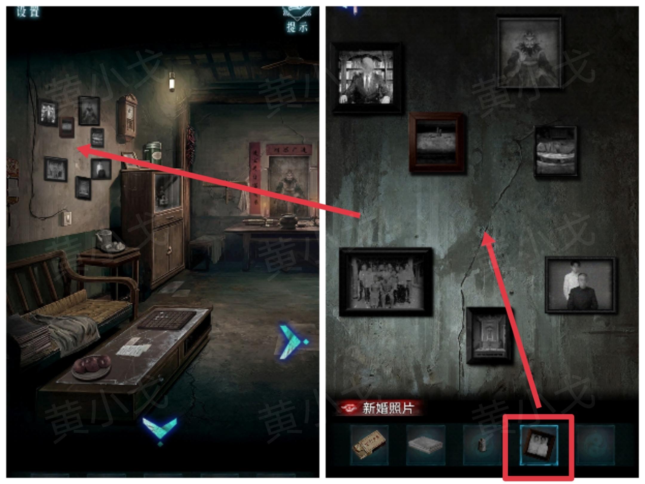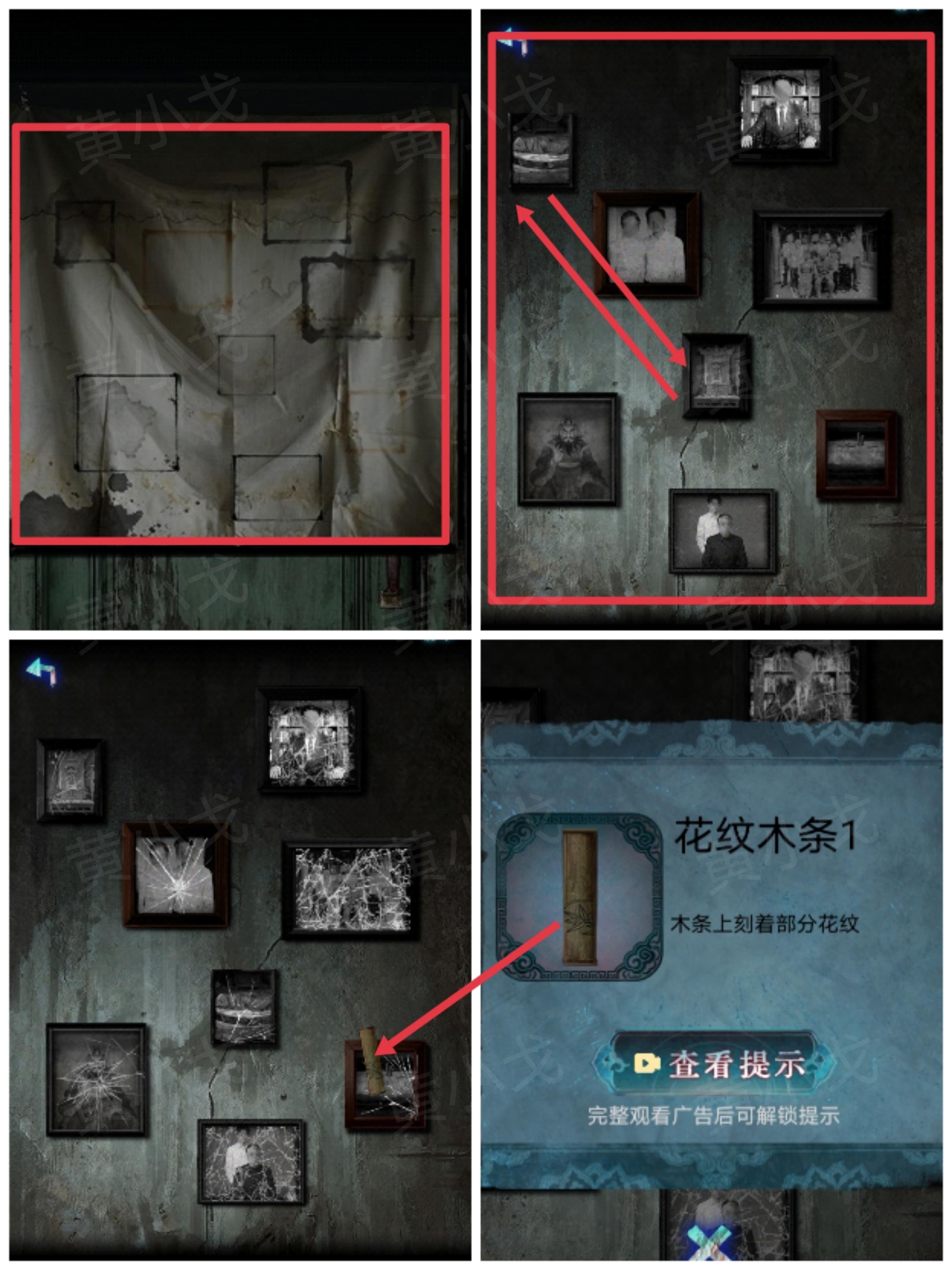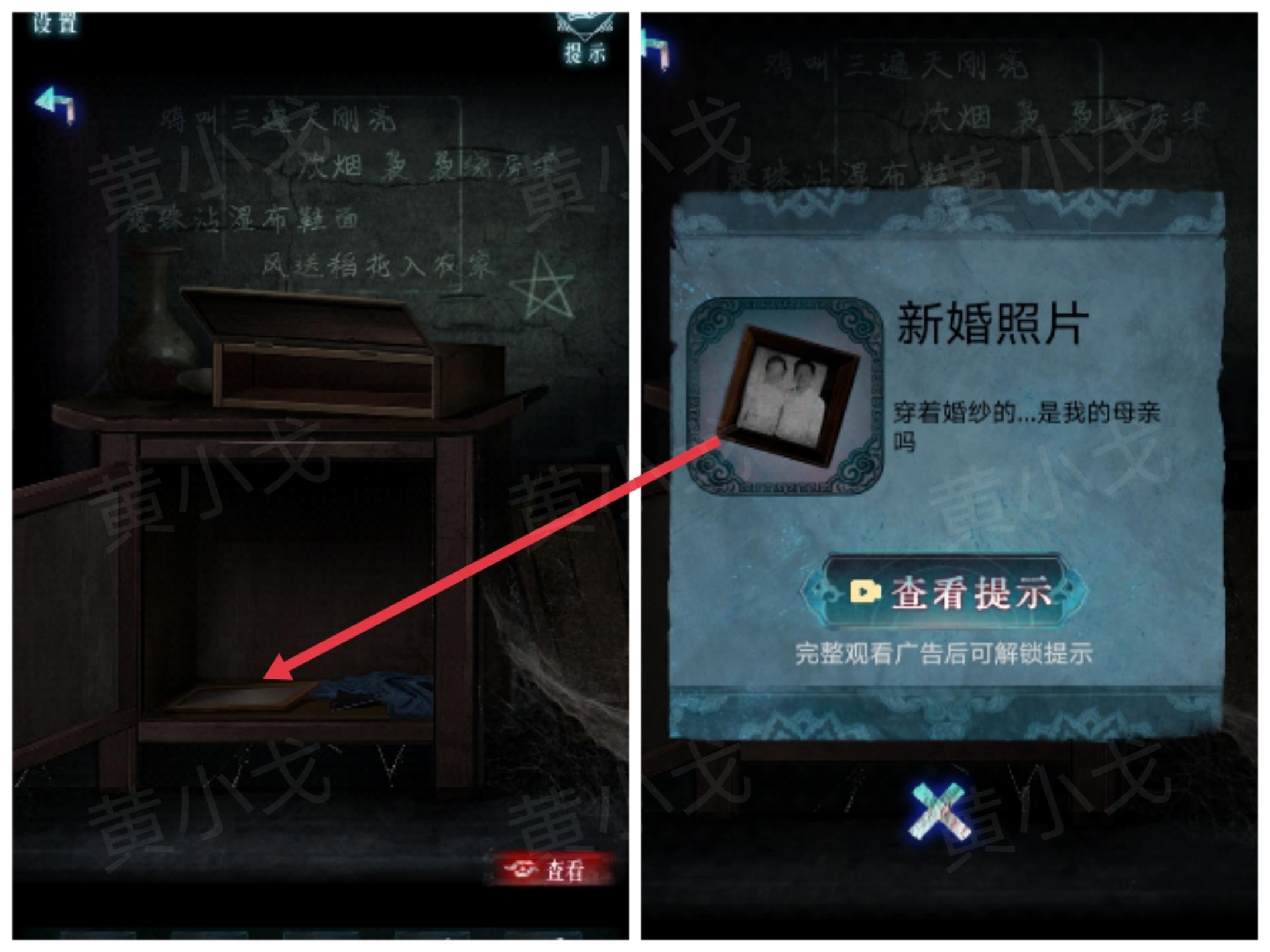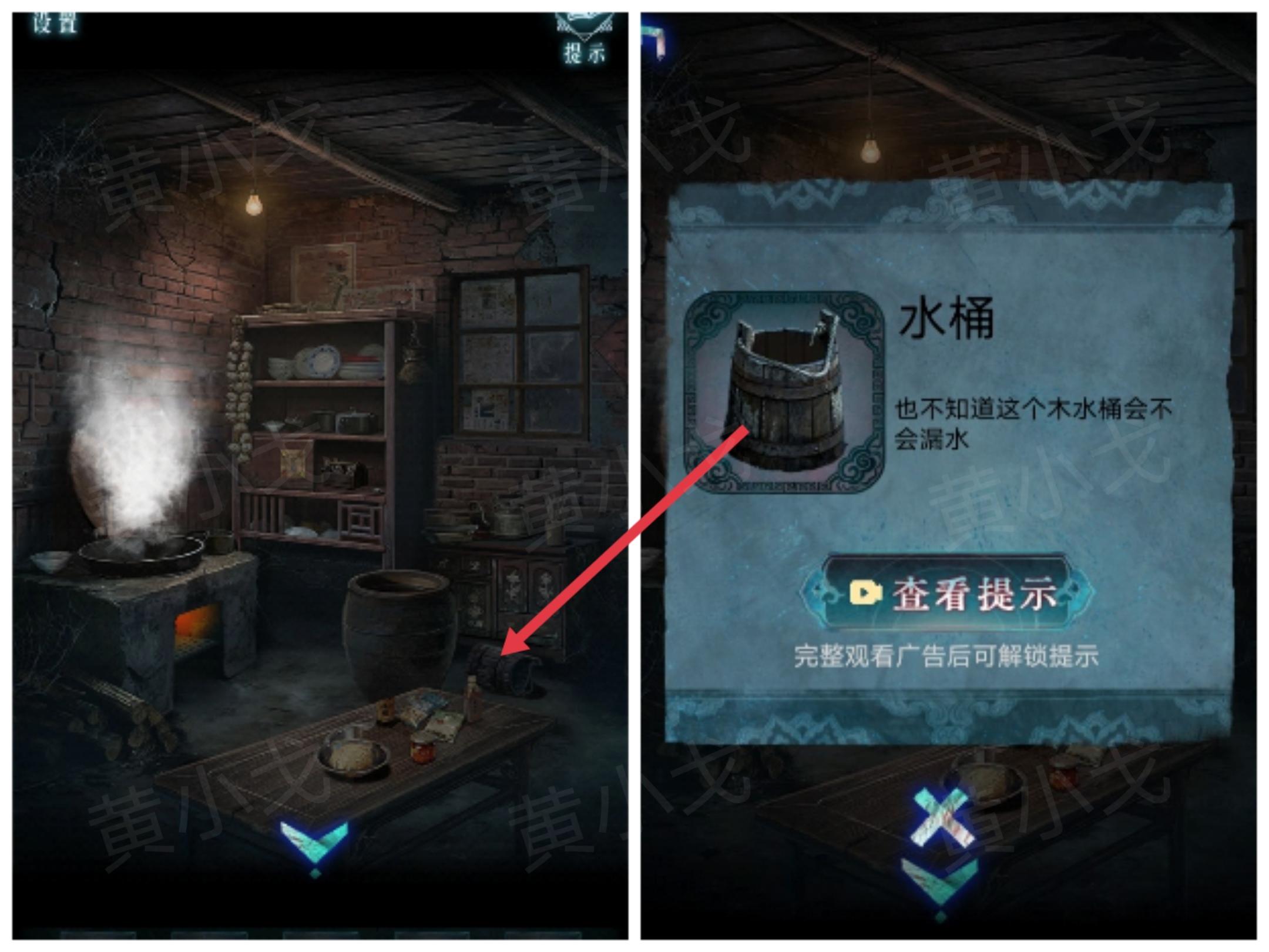 27.点击左侧卧室的门,将【一桶水】泼到门帘上,打湿门帘,出现图案,获得线索