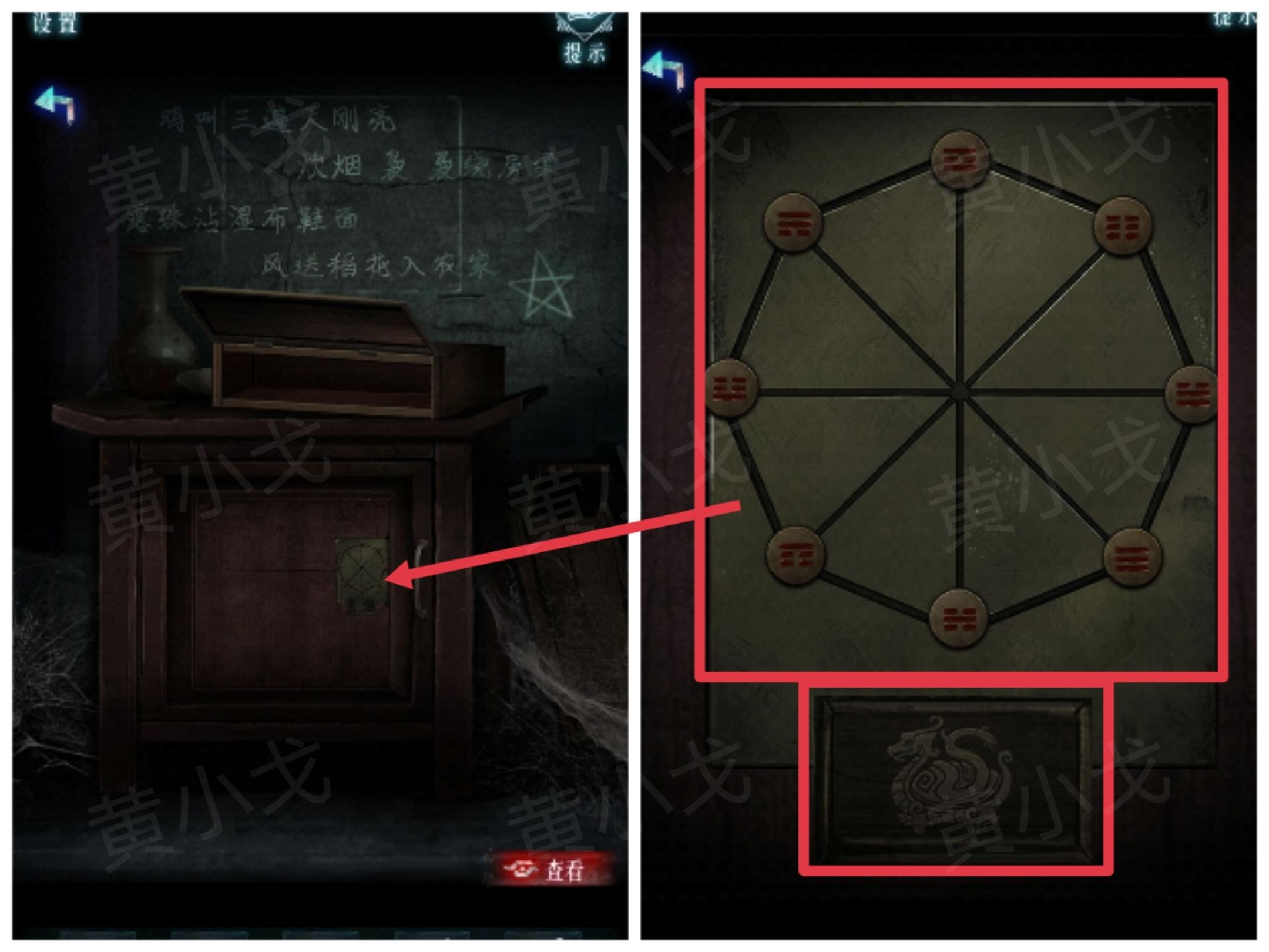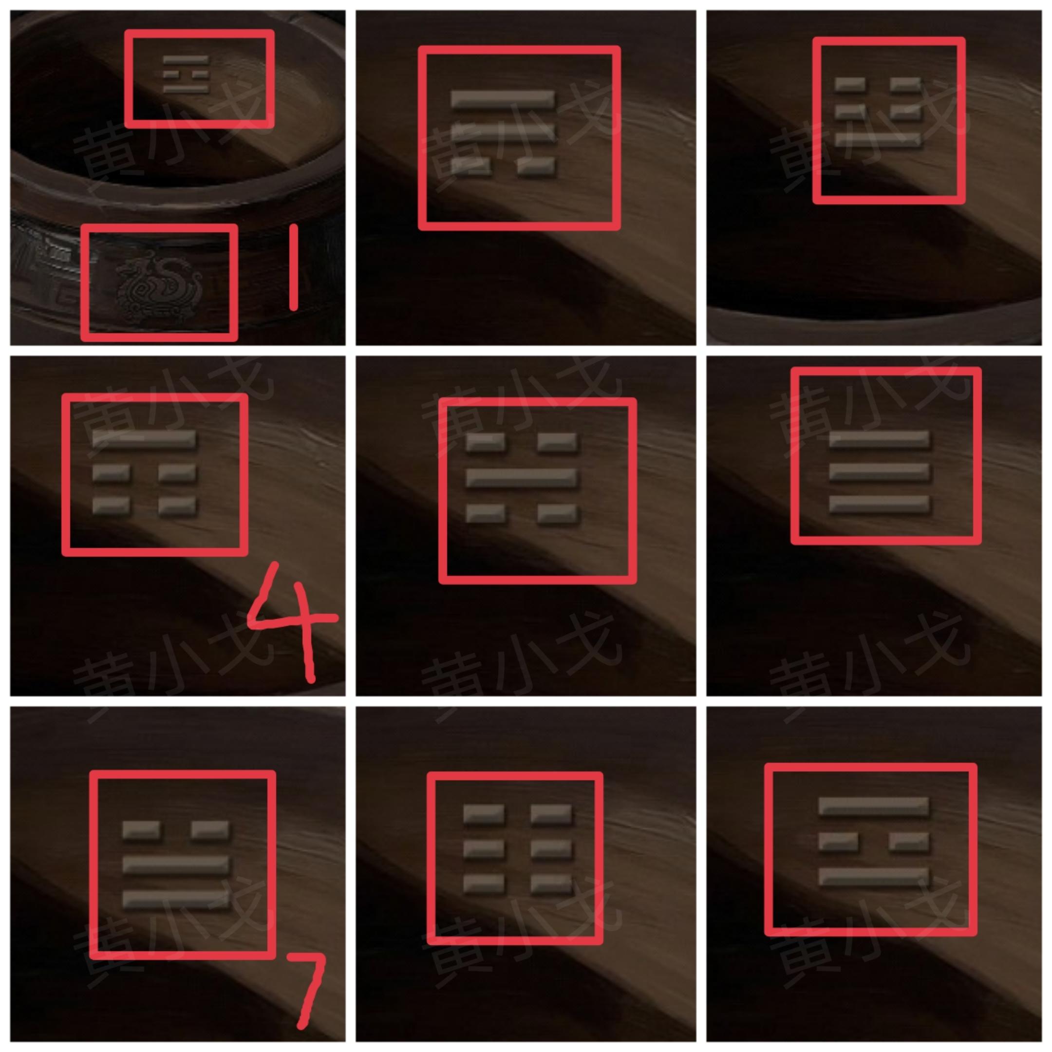 24.点击柜子上的机关,根据上面的玄武图案提示,结合[厨房]转动水缸后得到的八卦图案线索,调整对应八卦滑块的位置