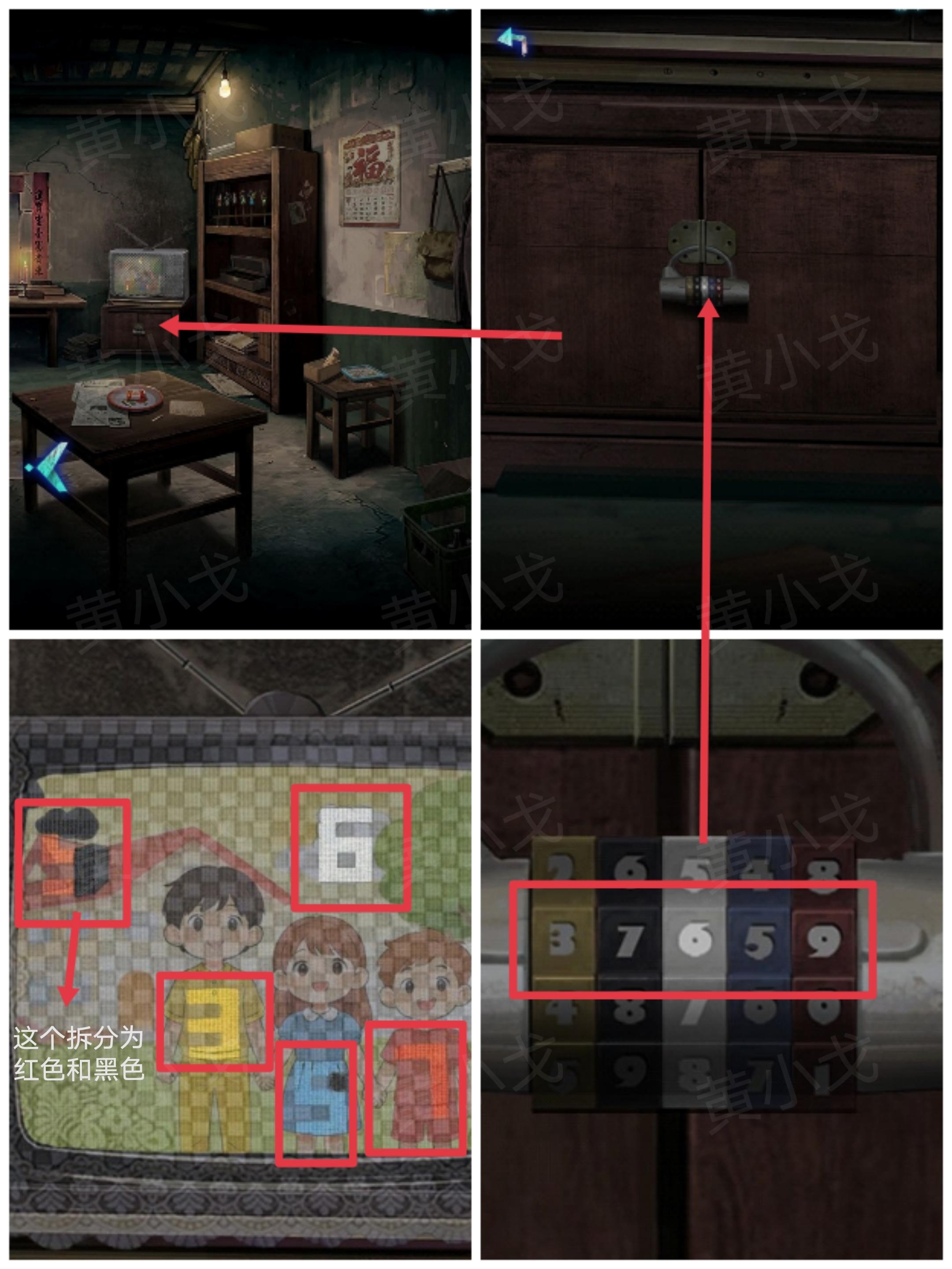 31.点击电视柜上的密码锁,根据上面的颜色提示,结合电视机画面上的线索,输入密码:37659