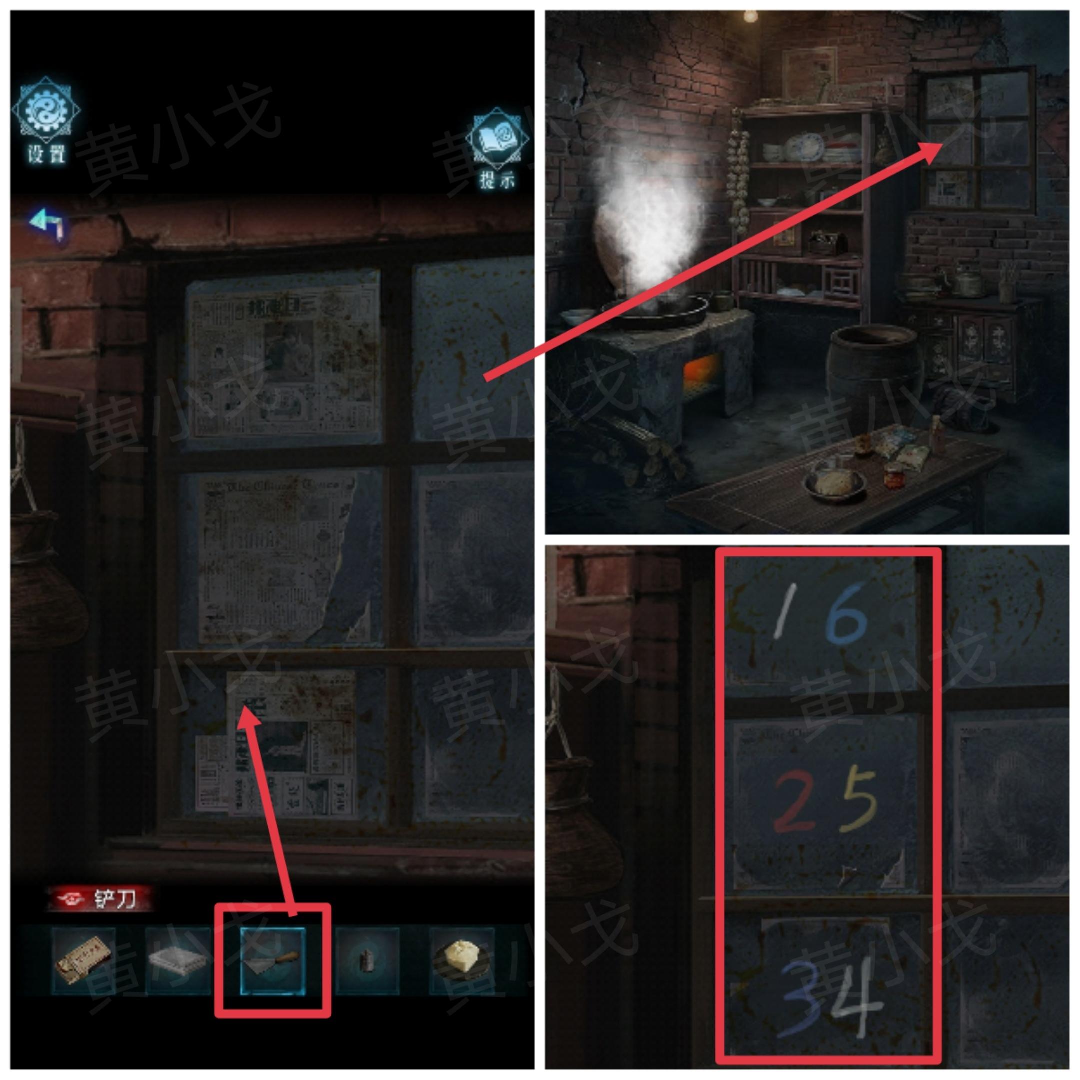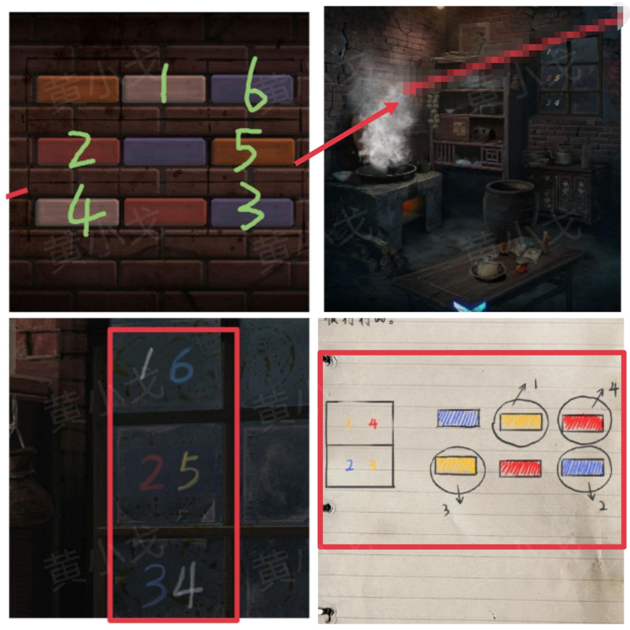 20.点击左侧墙上的特殊的砖块,根据窗户上的数字线索和[堂屋-右]日记本上的线索,按顺序按下砖块