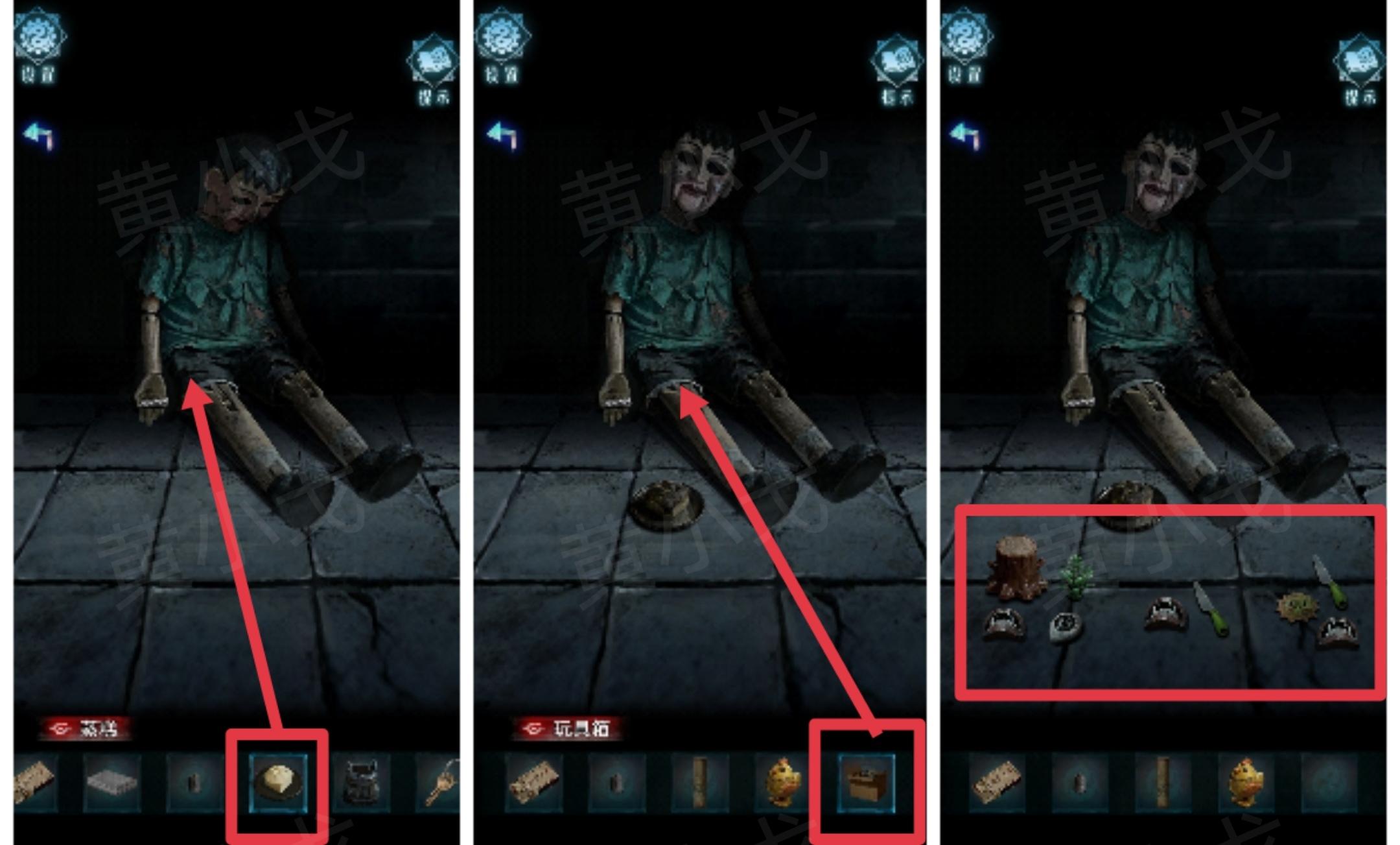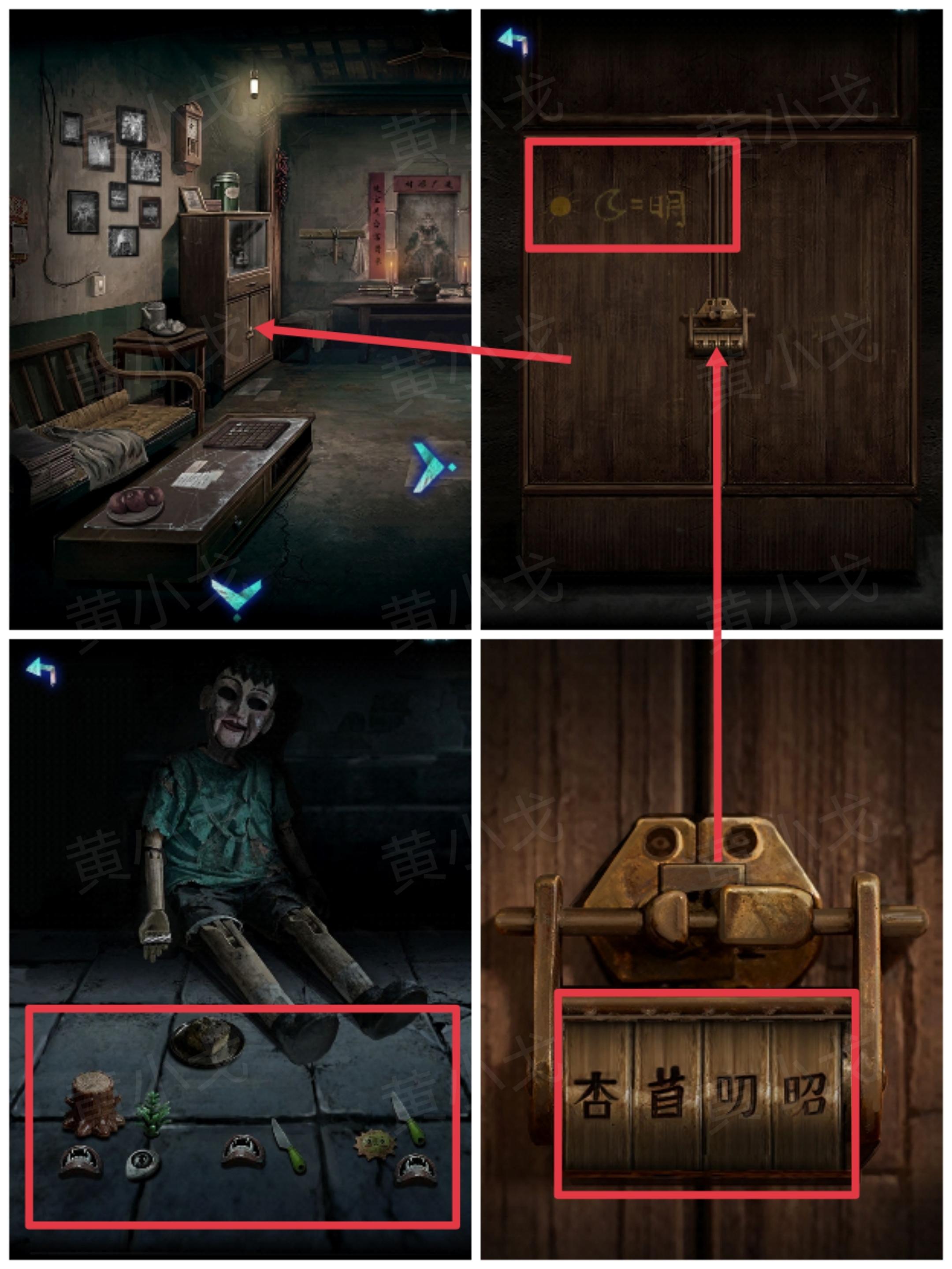 🔶[院子]木偶摆好玩具后得到的线索:上木下口,上草下目,左口右刀,左太阳(右:上刀下口)