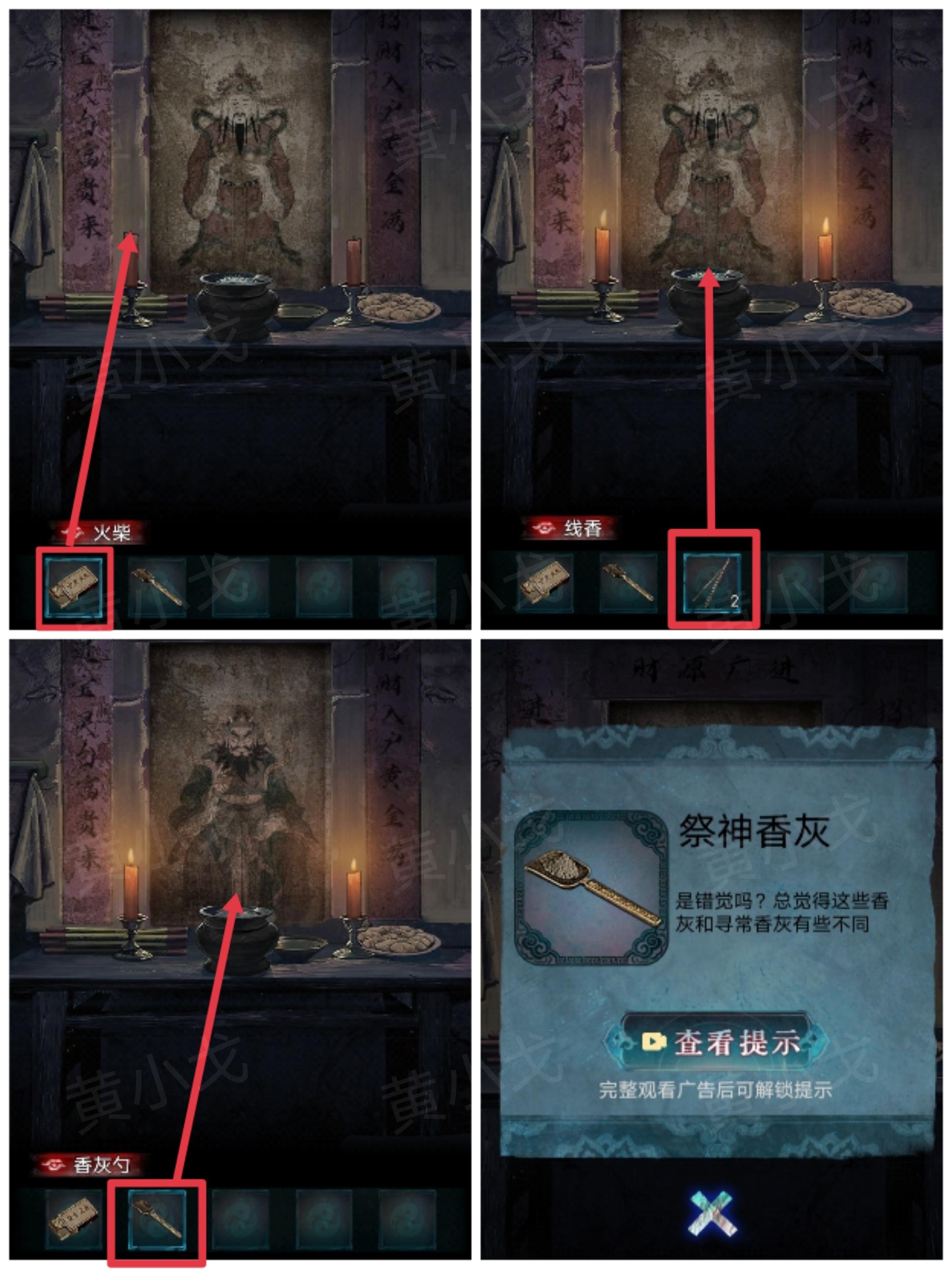 7.用【火柴】点燃蜡烛,把【线香】插入香炉,触发剧情,再插入另一捆【线香】,用【香灰勺】装取【祭神香灰】