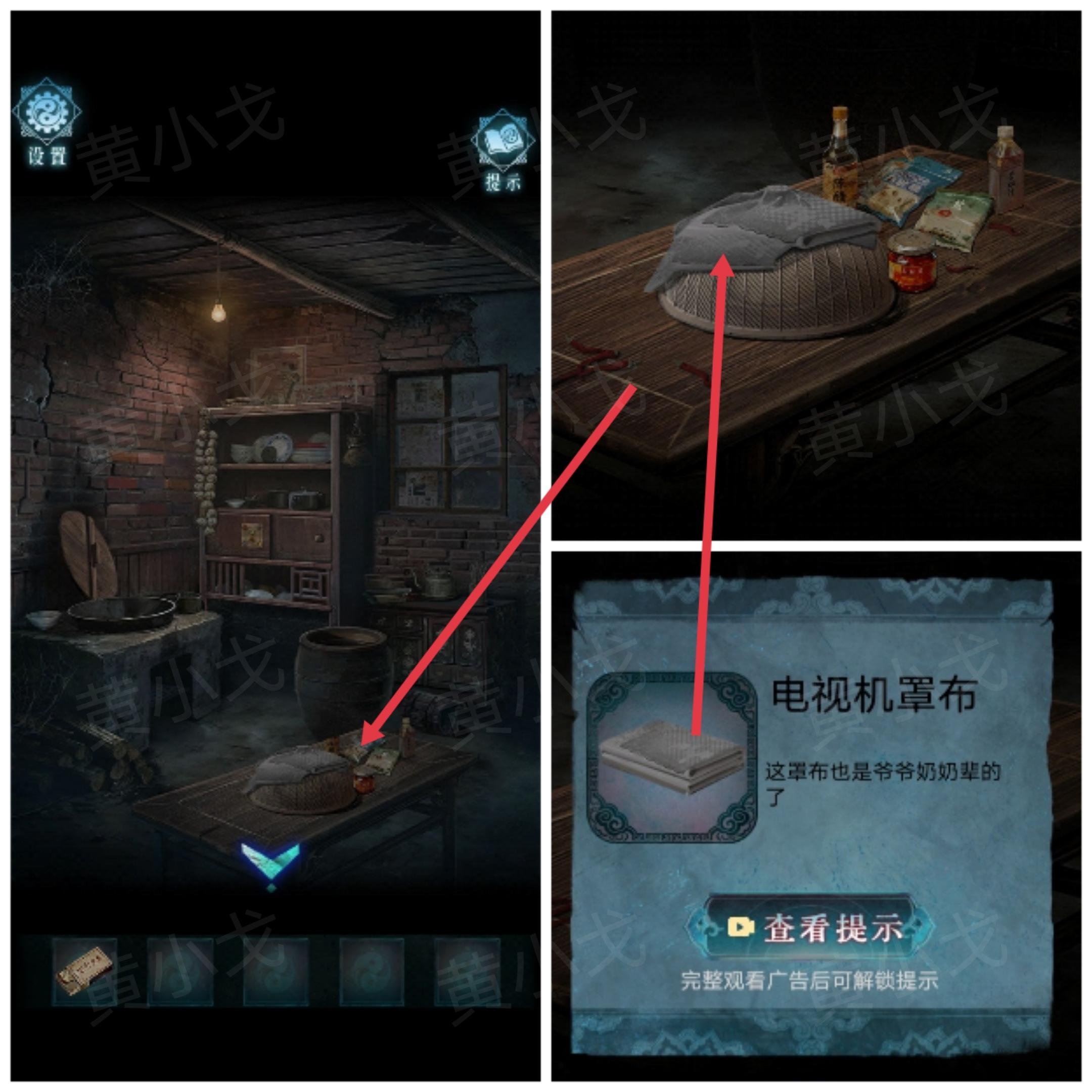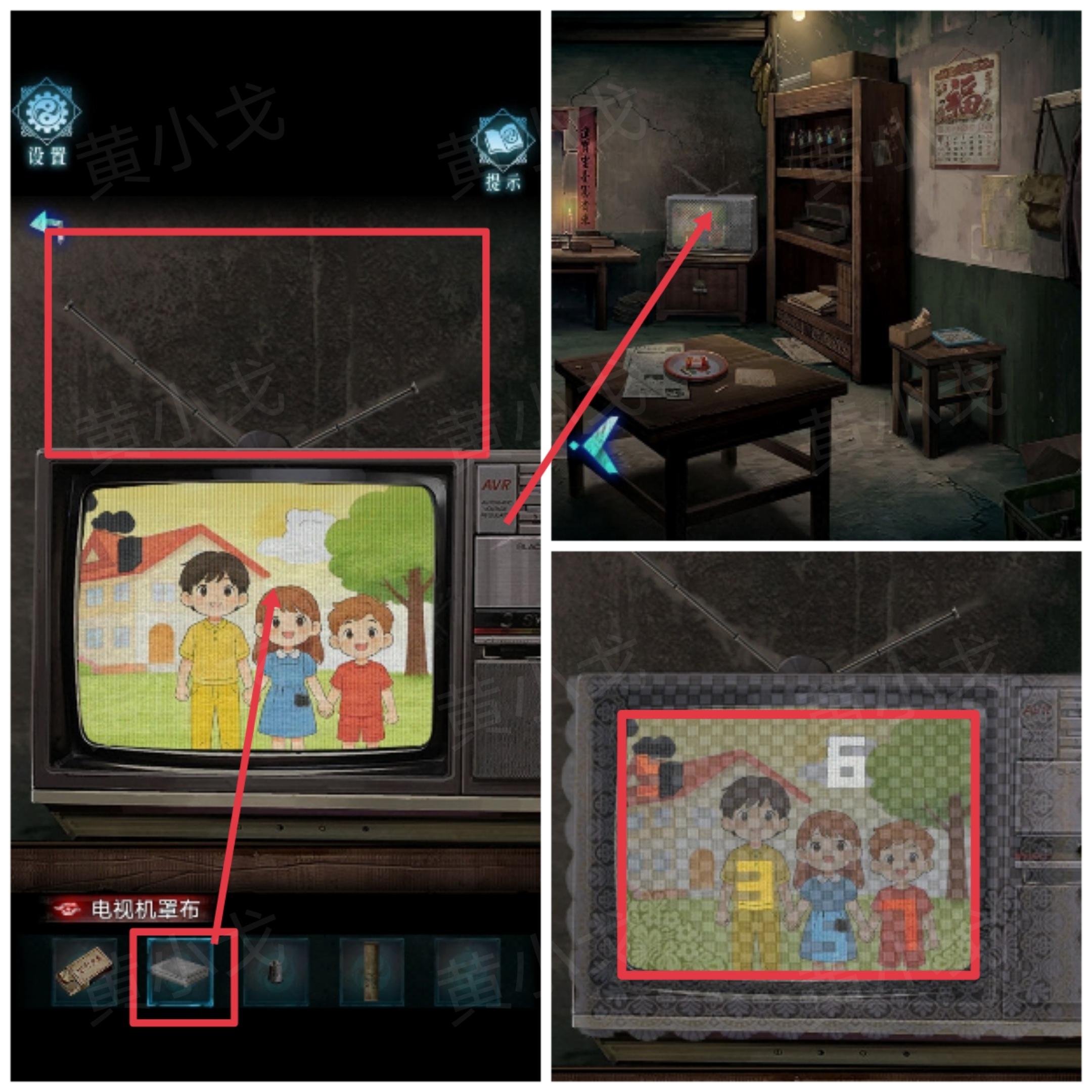 30.点击电视,调整天线的角度,出现画面,盖上【电视机罩布】,获得线索