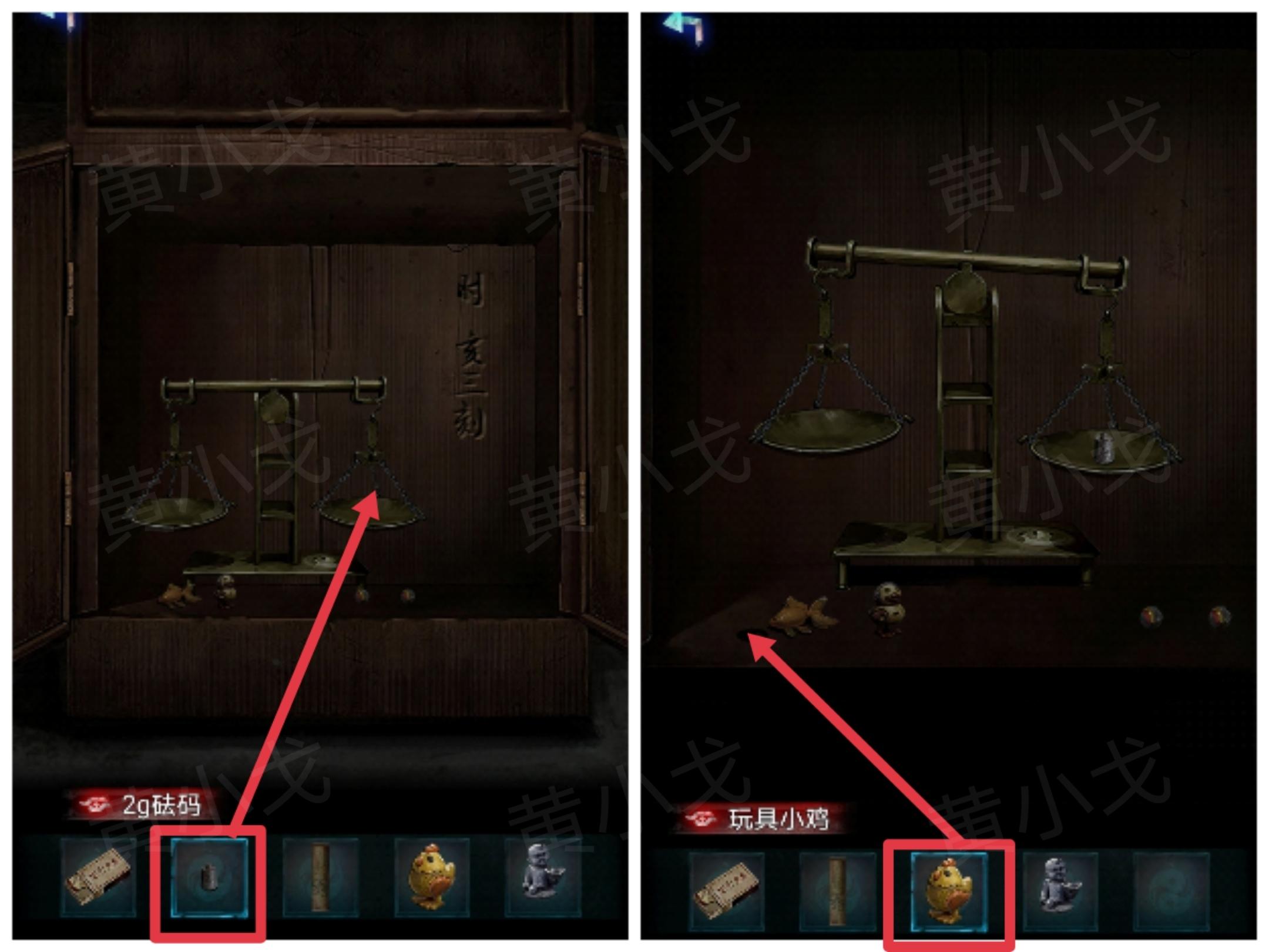 37.把【2g砝码】放到右侧秤盘上,【玩具小鸡】放到柜子里