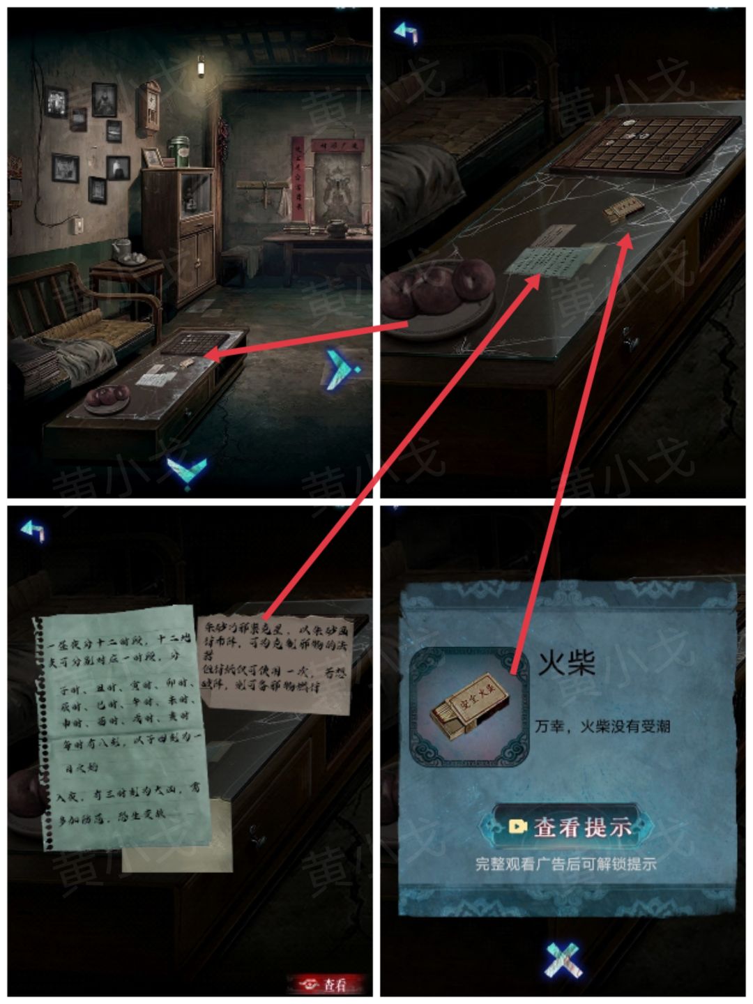 1.点击茶几,获得【火柴】,查看纸条内容,获得线索