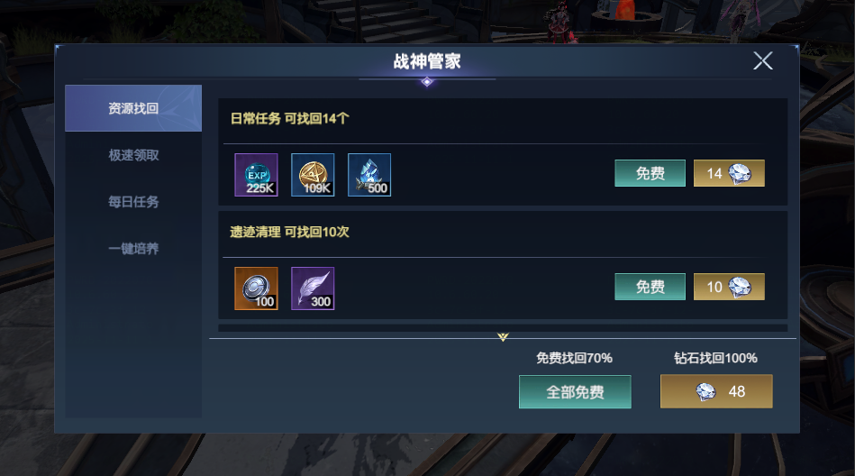 同时再也不用为偶尔错过任务而烦恼!全新的【资源找回】功能可以自动找回前一天未完成任务所遗漏的全部资源。忙里偷闲的间歇,也能轻松跟上大部队,完美解决你的后顾之忧。