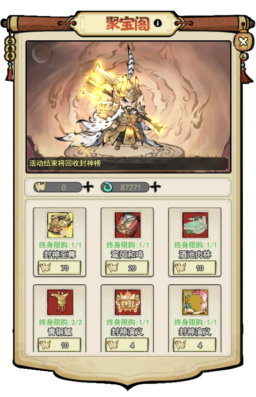 聚宝阁中包含了封神演义主题活动的独有奖励,包括“至尊时装·封神至尊、稀有时装·鸾凤和鸣、法宝·青铜觚、飞剑·酒池肉林、头像框、称号、聊天框”以及其他珍稀道具奖励~
