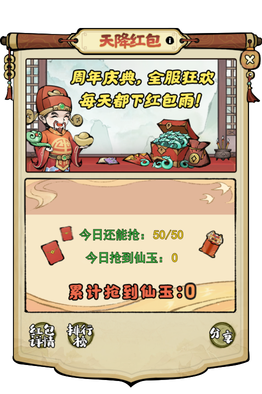 活动期间,每日8:00-22:00会有多场红包雨,点击红包后开启可抽取仙玉,仙友们每日可抢50个红包哦!
