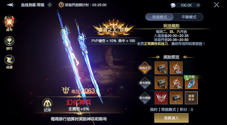 战斗至最后一刻,永不退缩!【血战到底】为你带来最残酷、最激烈的生死对决!多人跨服PK,吃鸡玩法,最后存活下来的1名玩家获胜。每周结算时,积分排名第一的玩家可获得专属神兵和称号!挑战极限,突破自我,只有真正的强者才能站到最后!