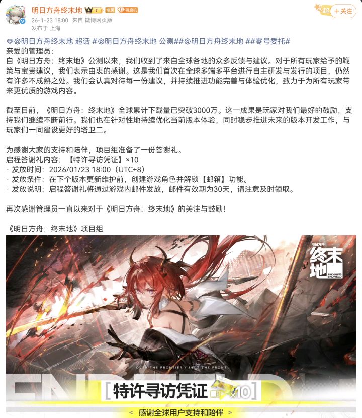 《终末地》下载破三千万!承诺会继续优化!