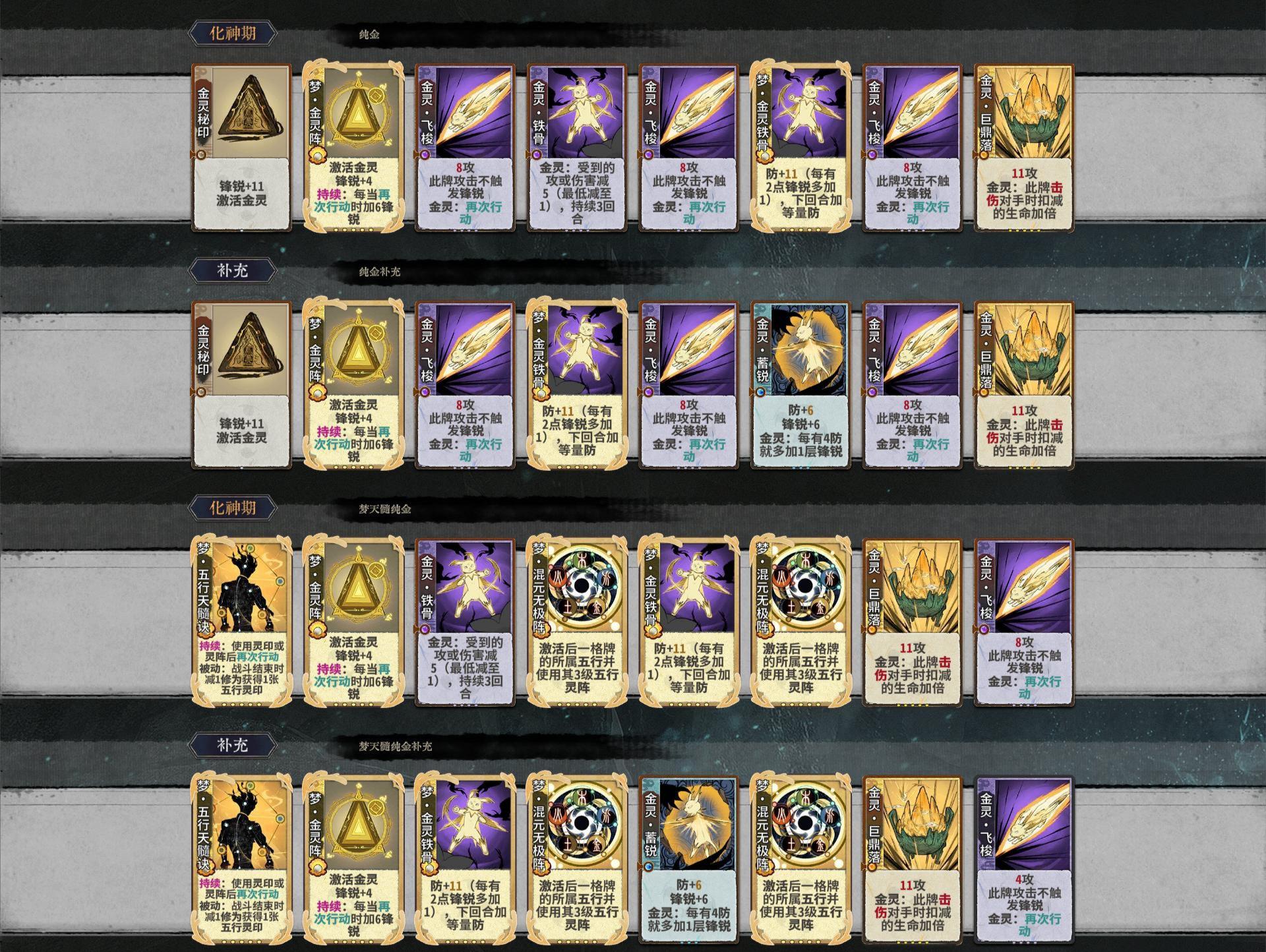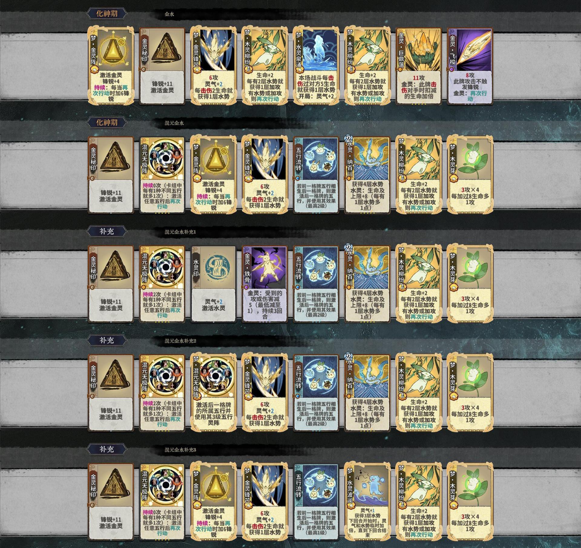 玩五行记得什么牌来的多就玩什么,金玩法中金水核心最少,构筑最多,是非常好的卡组。