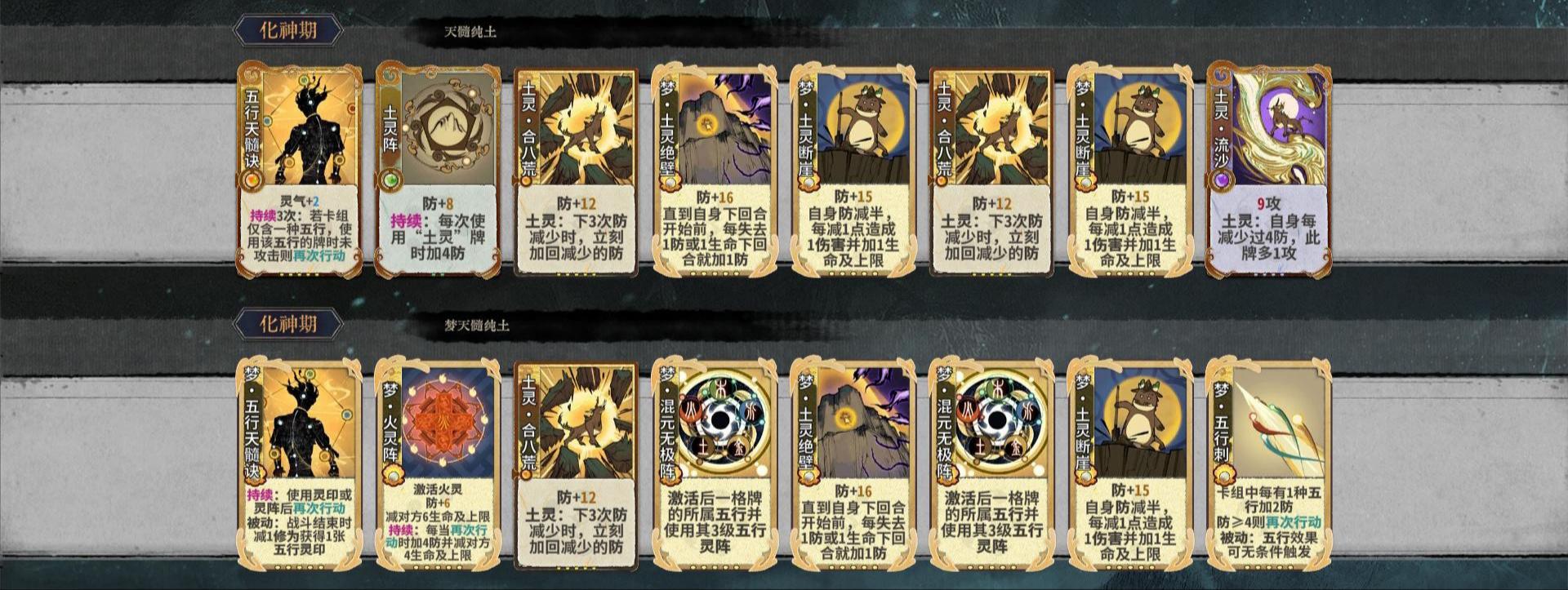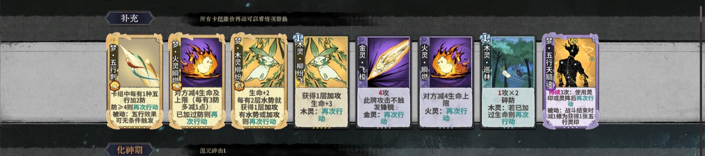 由于梦五行刺和各种梦再动牌的出现,五行的再动非常多,可以元婴开战力化神慢慢成型,节奏挺舒服。
