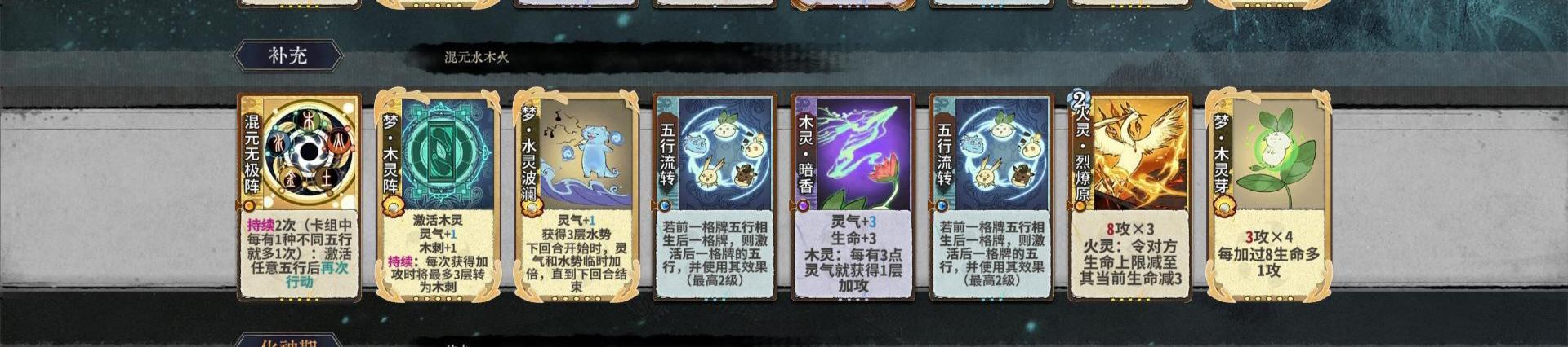 可以看到第一套卡组即使不需要混元给出的流转纳百川依然能组一个四动卡组,质量不够时实际也可以利用梦泉涌给的灵气把鼎换成纳百川,抗一下去打五动杀。