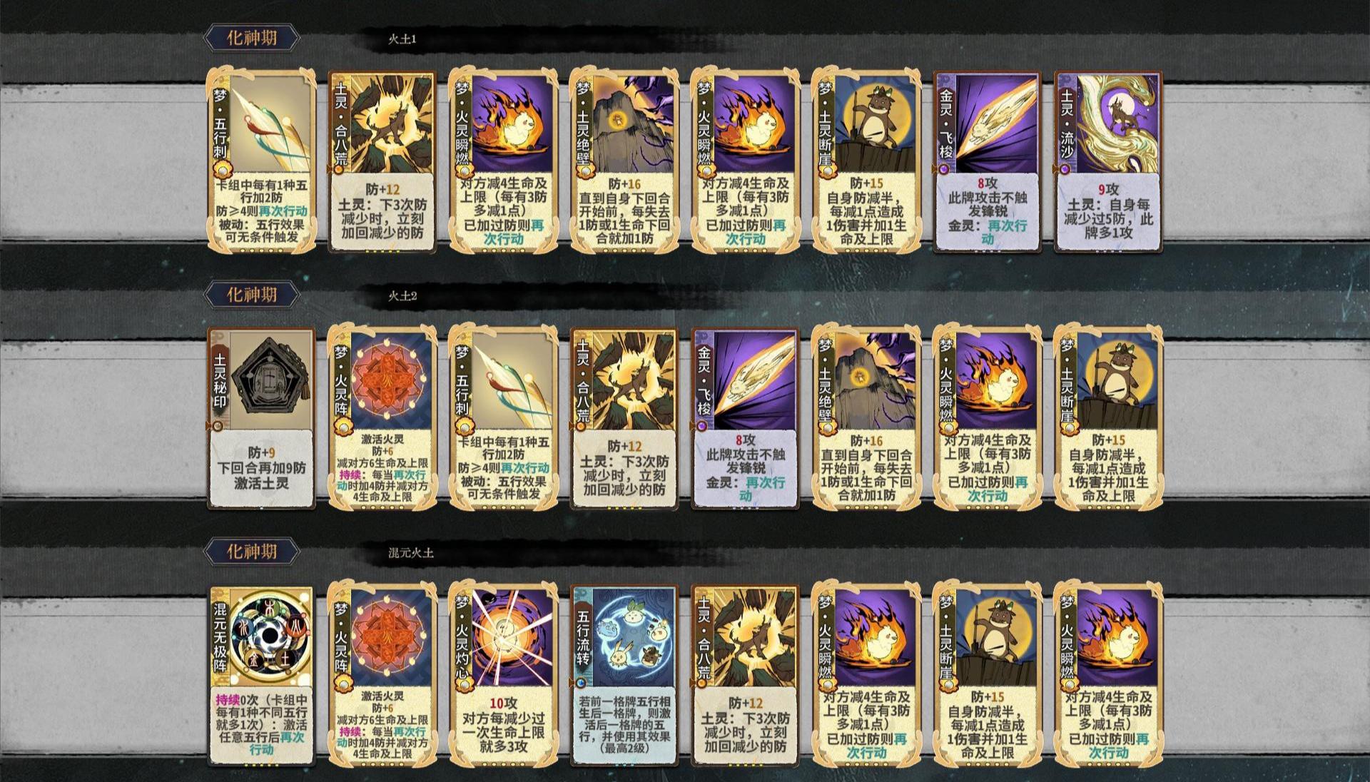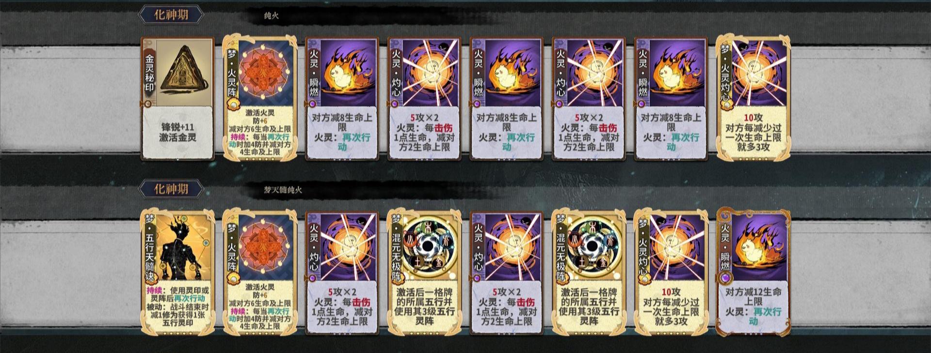 火体系是非常有数值的玩法,火阵给了每次再动都多了至少8点数值,下面给出纯火、火土两种主要玩法的卡组和点评。