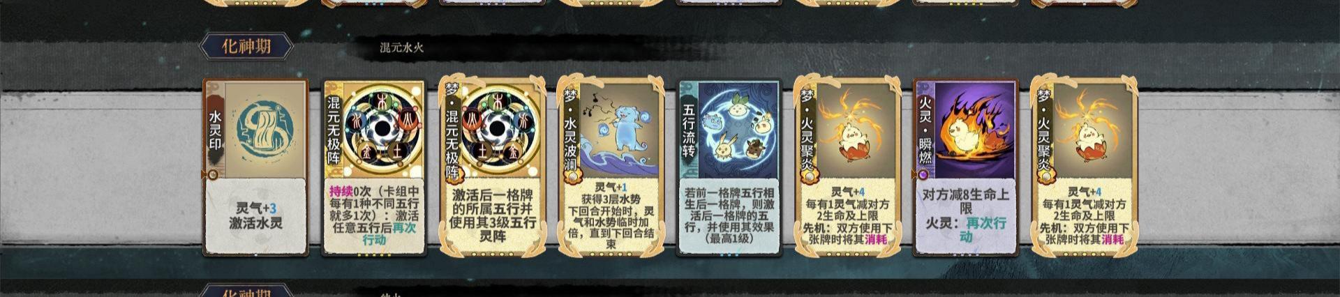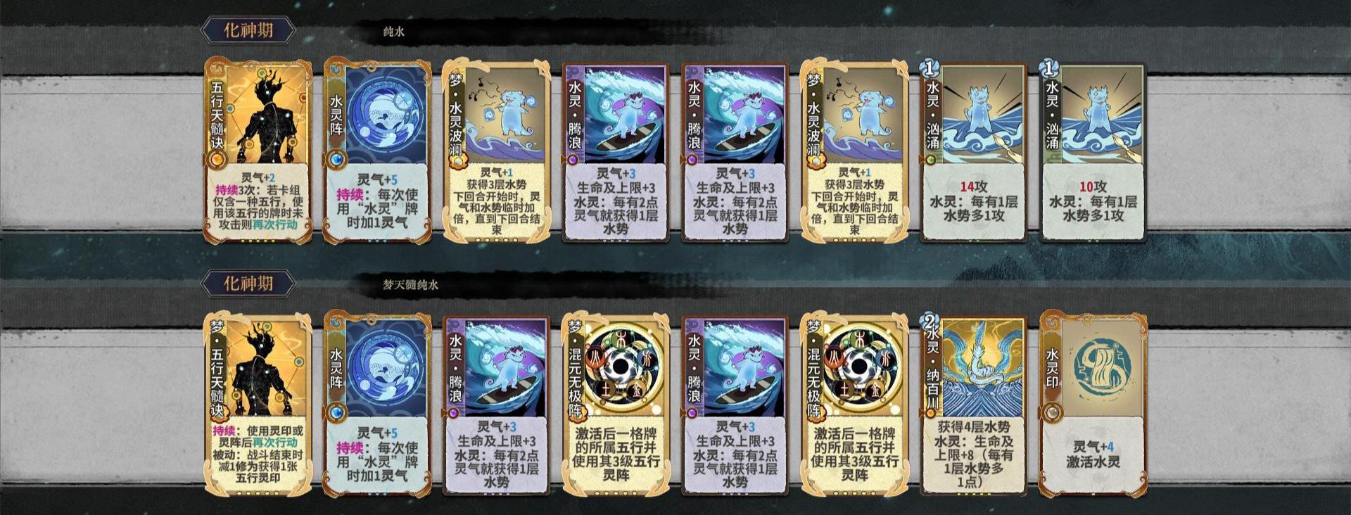 水体系是当前版本五行非常通用很有强度的玩法,同时南宫的相生之火还可以把水的大量灵气给梦聚炎利用,下面给出纯水、水火两种主要玩法卡组和点评。