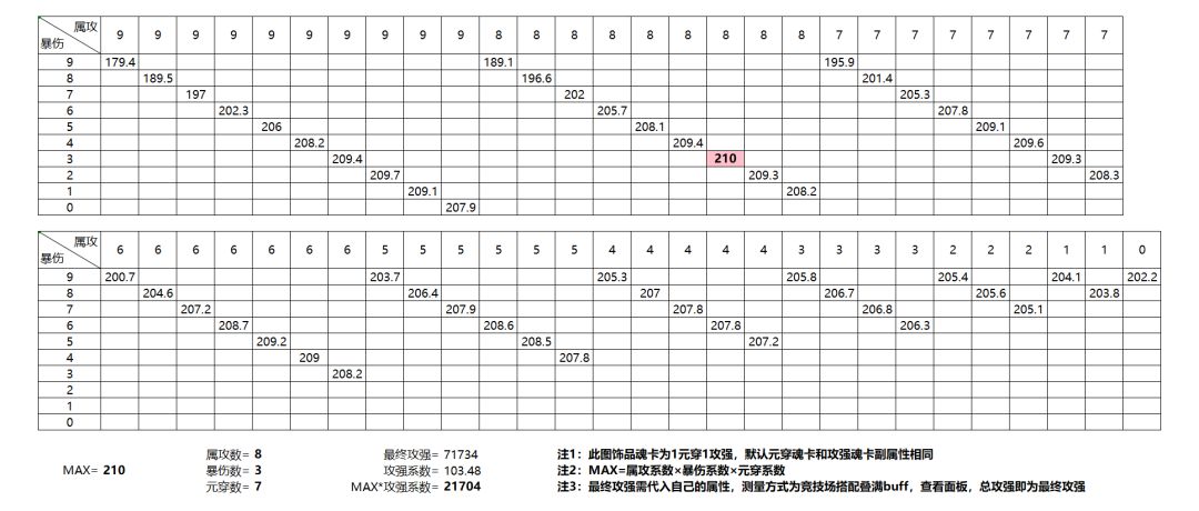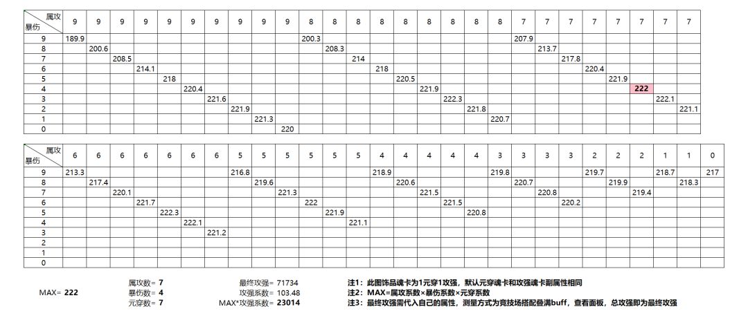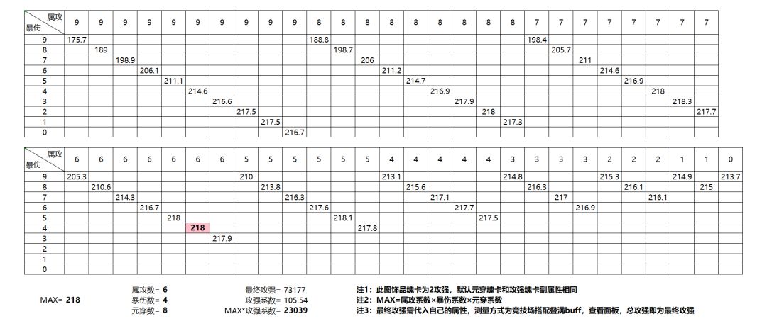 竞技场宝石属性有属攻、暴伤、元穿三种选择,优先计算出三种饰品魂卡带法下(2元穿,1元穿1攻强,2攻强)宝石搭配出的最高伤害系数,再将三个最高伤害系数分别和三种魂卡带法下的攻强系数相乘,最高即为最优选择。由于本篇要最后计算宝石属性分配,所以公式中的最终属攻、最终暴伤、最终元穿都是不包含宝石加成的。