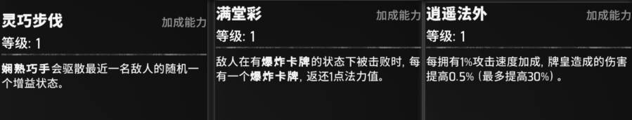 61级解锁天赋【逍遥法外】牌皇每有1%攻速加成,自身造成的伤害就会提高0.5%最高30%,牌皇要想吃满就要与【理智1】那副,就要叠到60%的攻速提升。