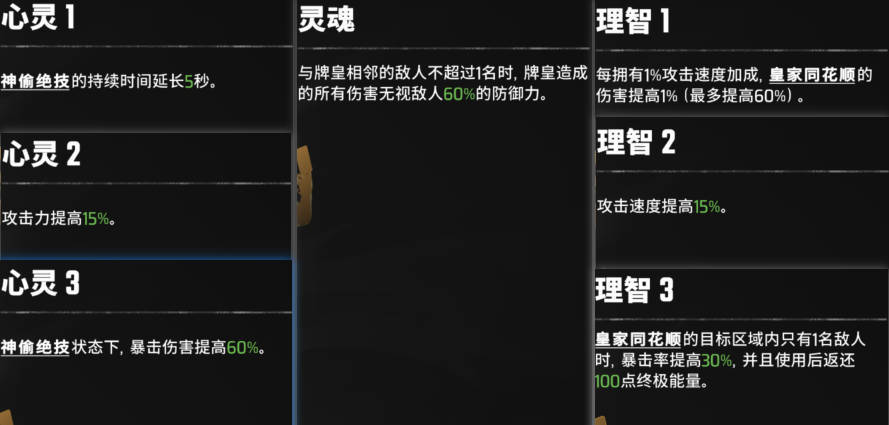 解锁灵魂之旅【心灵3】状态下,提高暴击伤害,不过需要注意牌皇各个加成上是没有暴率方面的,所以想要吃到暴伤加成,玩家要考虑暴率方面属性。