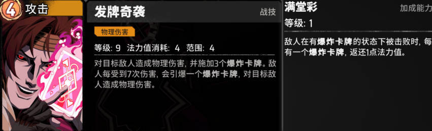 41级解锁天赋【满堂彩】简述来说就是卡牌回收,目标每携带一张爆炸卡牌死去,就会返还对应数量的法力值,最多就是3点,也就说利用这个机制,在对付残血的敌人释放技能后,该战技就是一费战技270%,所以这个卡牌的设计恐怕本身就是一费战技,不过为了限制强度,所以设计成了需要满足条件才能打出后续3段的伤害。