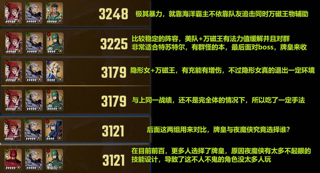上面的数据还不是【疾速支援】环境这种普攻与攻速有加成的环境就能打出那么好的数据,国服的话数据就会更好,目前国服没那么多角色,都是纯用了海洋霸主与美队,所以如果你抽取到牌皇不妨可以等到万磁王上线。