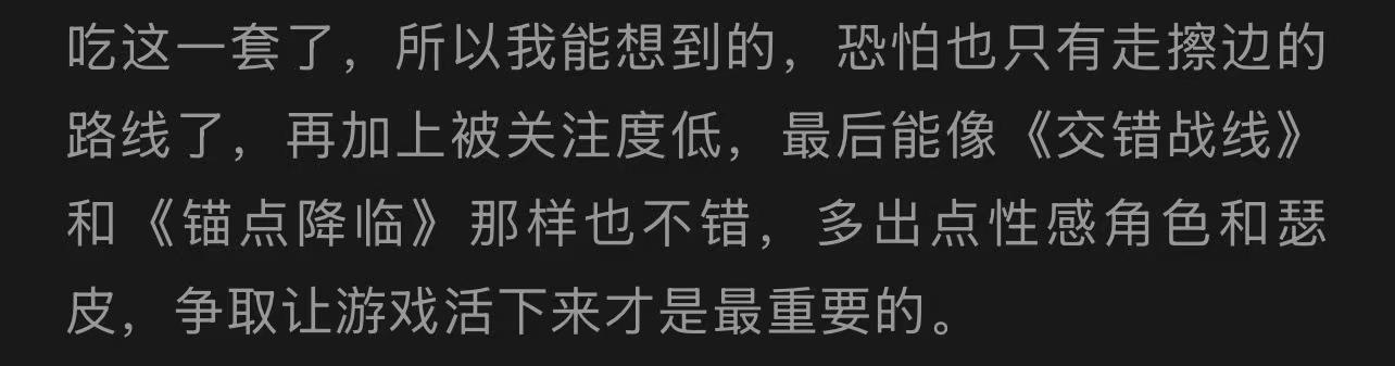 我当时对这款游戏最大的吐槽主要是那令人恶心的主线,又臭又长的流程和单调的爬上爬下的地图设计,完全不符合动作类游戏本身的调性,变成了纯粹的累赘。但单就战斗本身而言还算是好玩的(至少比黑色信标好玩),我在之前的文章里分析过游戏的困境,鉴于地狱般的开局以及游戏对于动作表现并不尽如人意的情况下,该如何增加自身的付费驱动而建议过干脆学《交错战线》等游戏在角色设计上走卖肉路线,反正无人关注的角落,自己主要用户群体的喜好也符合“瑟瑟是第一生产力”的原则,所以先让自己能活下去再说。