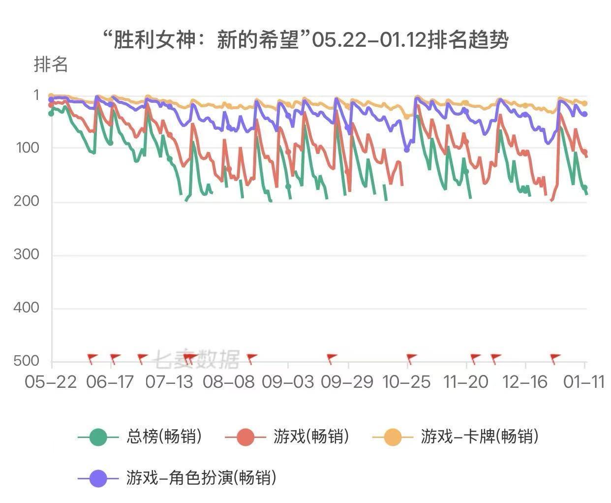 除此之外这种在海外先行上线很久才在国上线的游戏,在运营迭代的规划上要面临一个很大的问题就是版本更新节奏的把控。为了追求收入以及跟上海外版本进度,快速迭代,恨不得两个月走完人家两年的路的情况是不可取的。比如开服主推的角色,花钱拉满后没多久呢可能出下个新角色的时候被淘汰了,在这种情况下,玩家就会开始变得愈发谨慎。国服妮姬也一度出现这种现象,再加上可以很容易查阅到海外服的大量攻略,玩家可以很清楚哪些角色保值,以至于在付费上玩家就变得谨慎了很多,相应也可以看到官方以此为基准来制定后续活动和角色上线的排期,在非强势角色推出的时间,游戏收入曲线明显下滑,在强力角色上线时又明显上升。