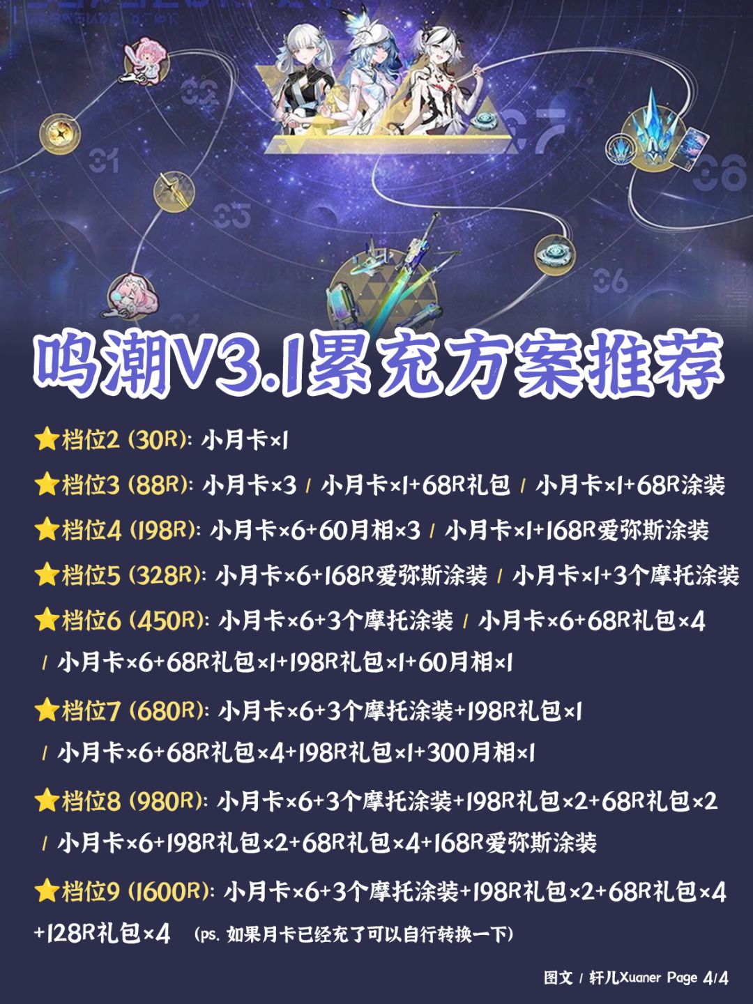 鸣潮3.1版本会上线一个累充活动,前瞻时只是提了一下。很多漂泊者求详解,轩儿Xuaner这里帮大家整理了一份活动详解和各档位奖励获得的充值方案推荐,仅供参考~