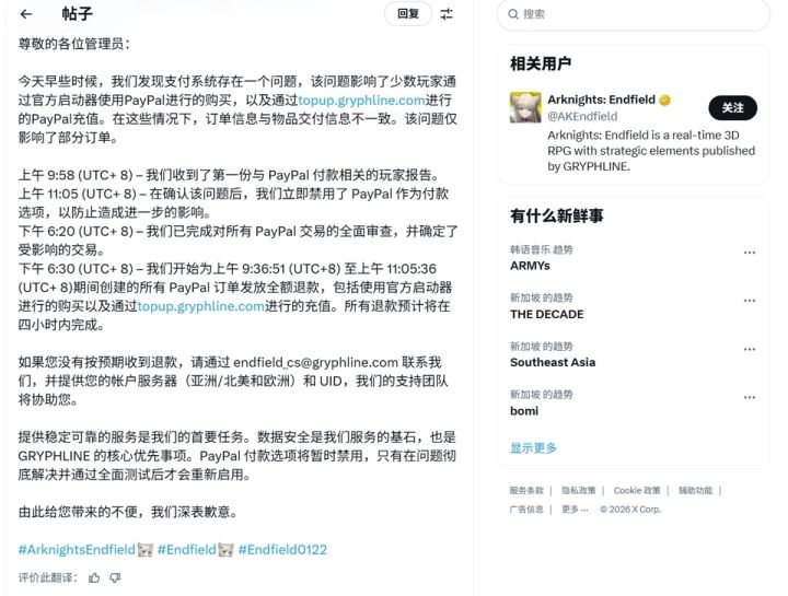 眼看出大事了,鹰角网络反应还算快。他们紧急关闭了PayPal支付渠道,并表示正在全面审查所有相关交易,承诺会对所有受影响的订单进行全额退款,事后,鹰角网络对此事做出了紧急处理,对特定时间段内的所有交易进行了退款,算是稍微弥补了自己的过错