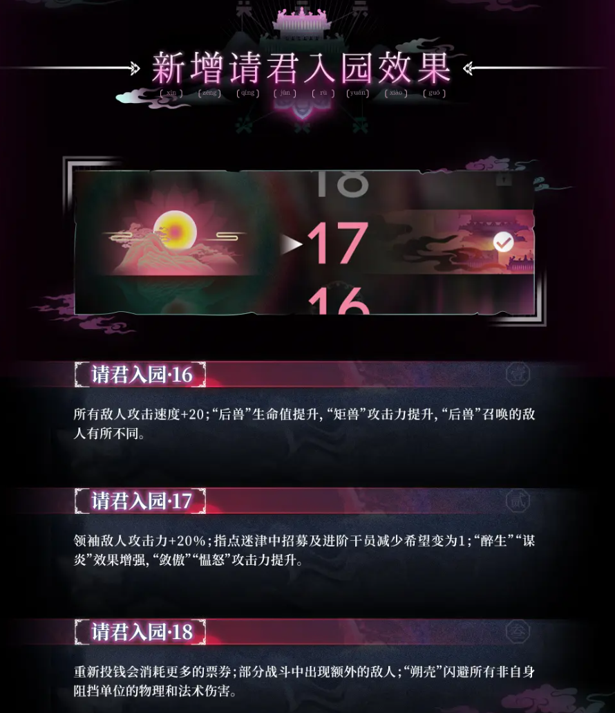 领袖敌人攻击力+20%;指点迷津中招募及进阶干员减少希望变为1;“醉生”,“谋炎”效果增强,“敛傲”“温怒”攻击力提升。