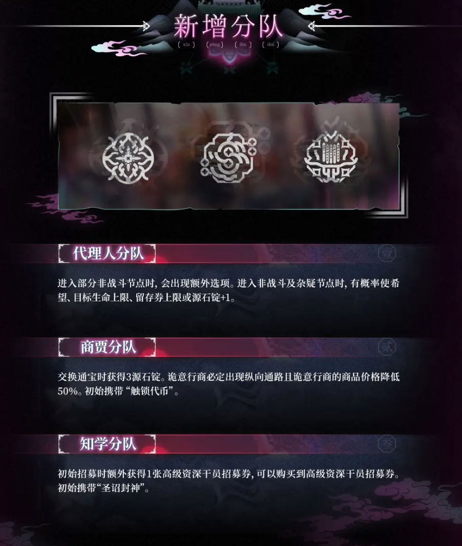 商贾分队:交换通宝时获得3源石锭。诡意行商必定出现纵向通路且诡意行商的商品价格降低50%。初始携带“触锁代币”。