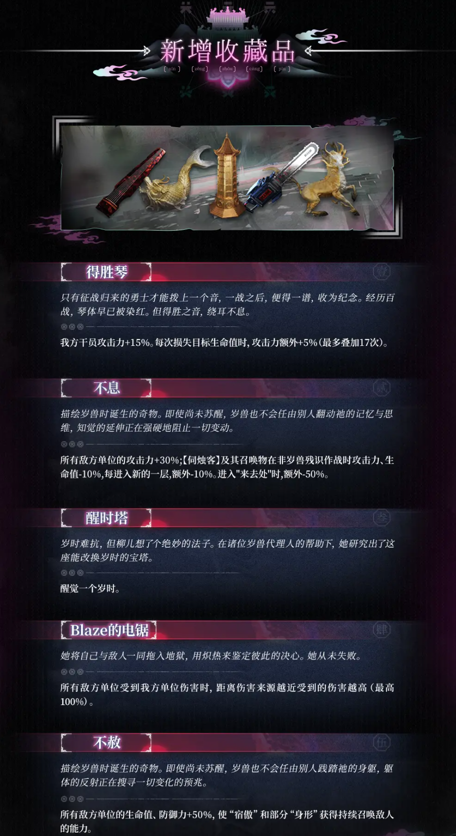 不赦:所有敌方单位的生命值、防御力+50%,使“宿傲”和部分“身形”获得持续召唤敌人的能力。